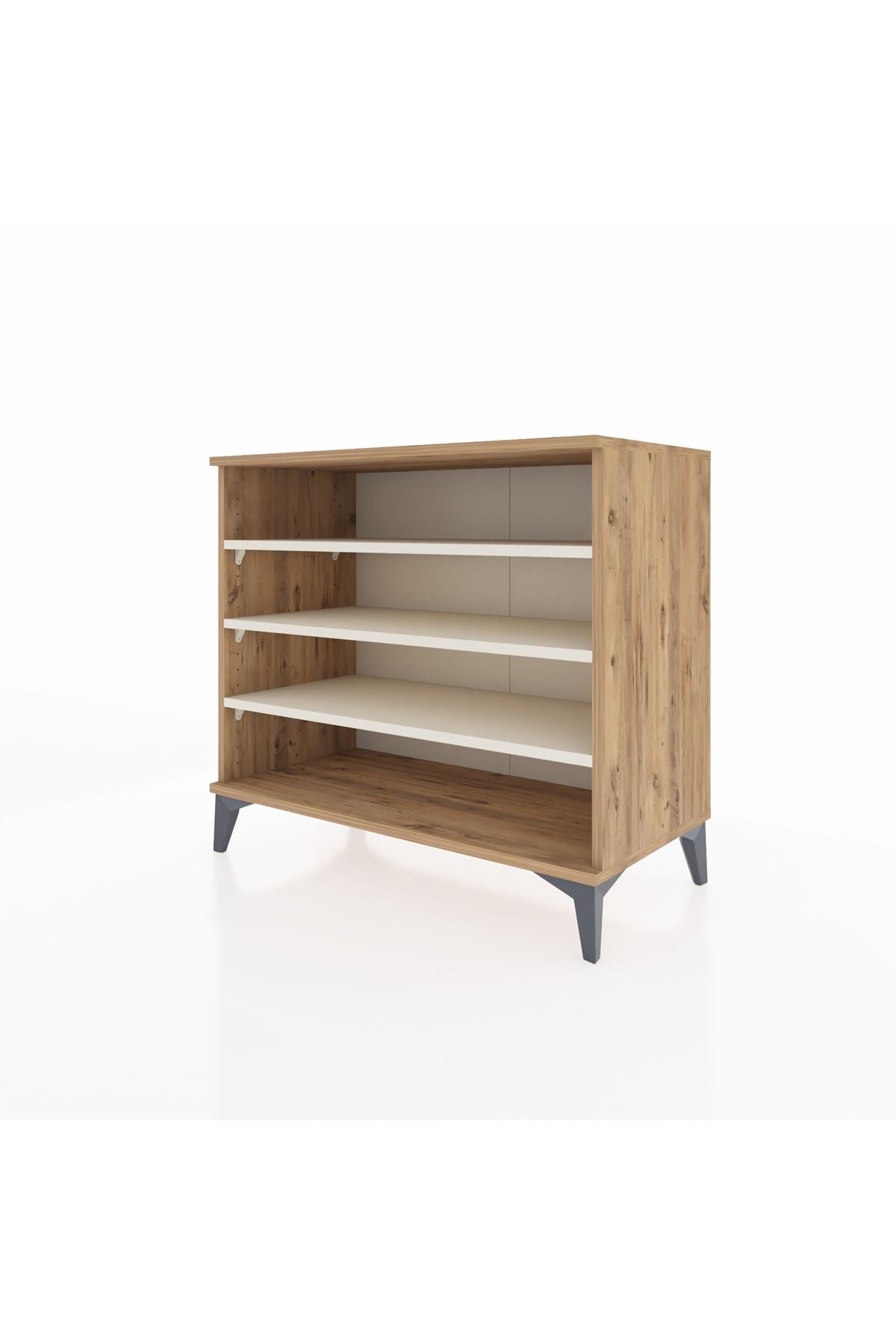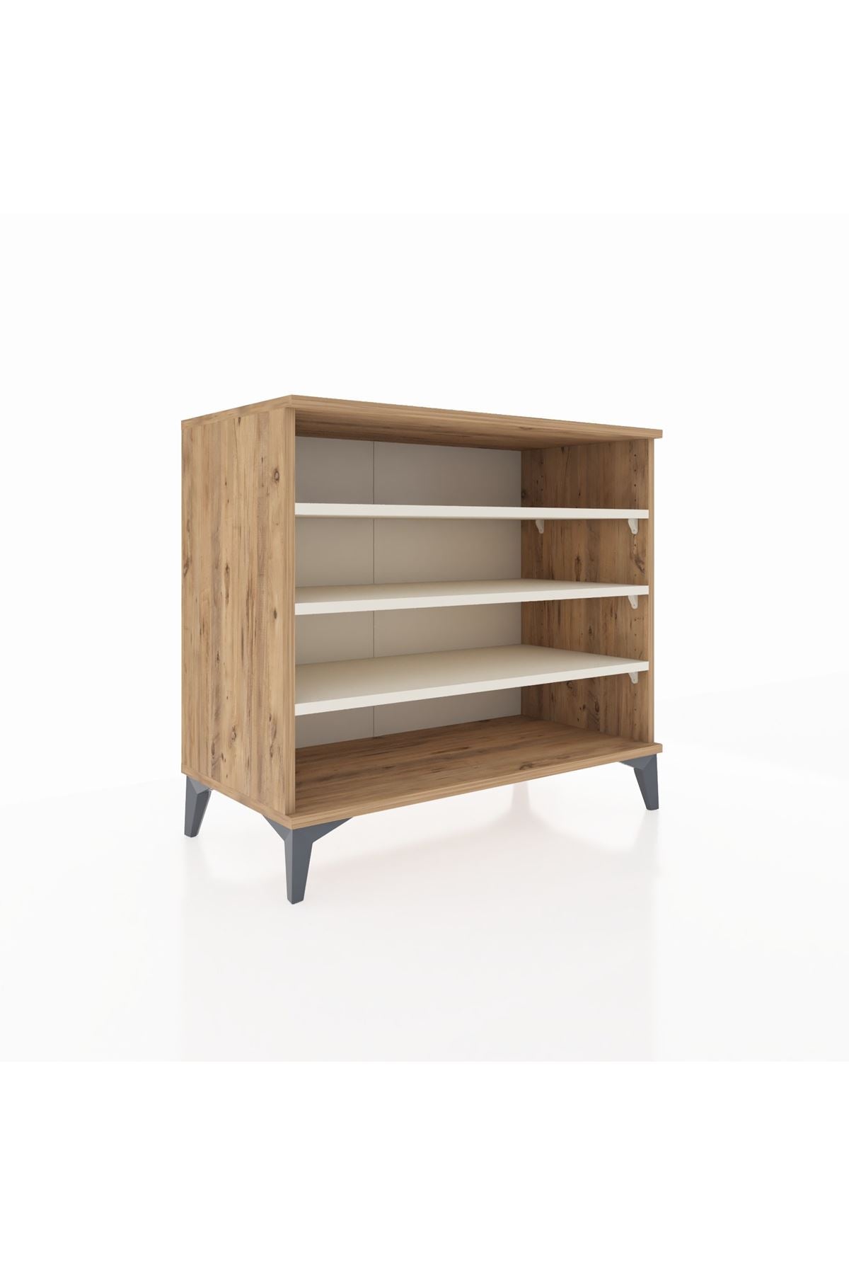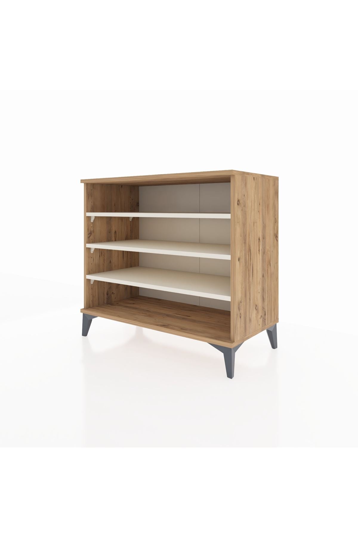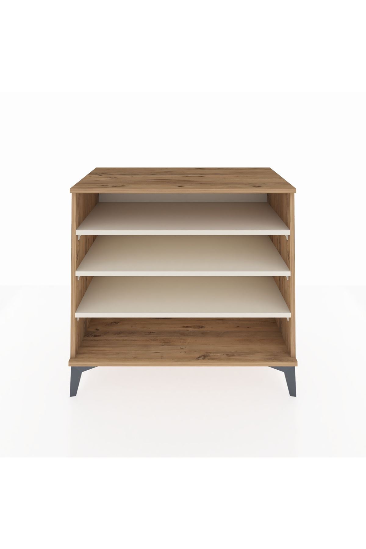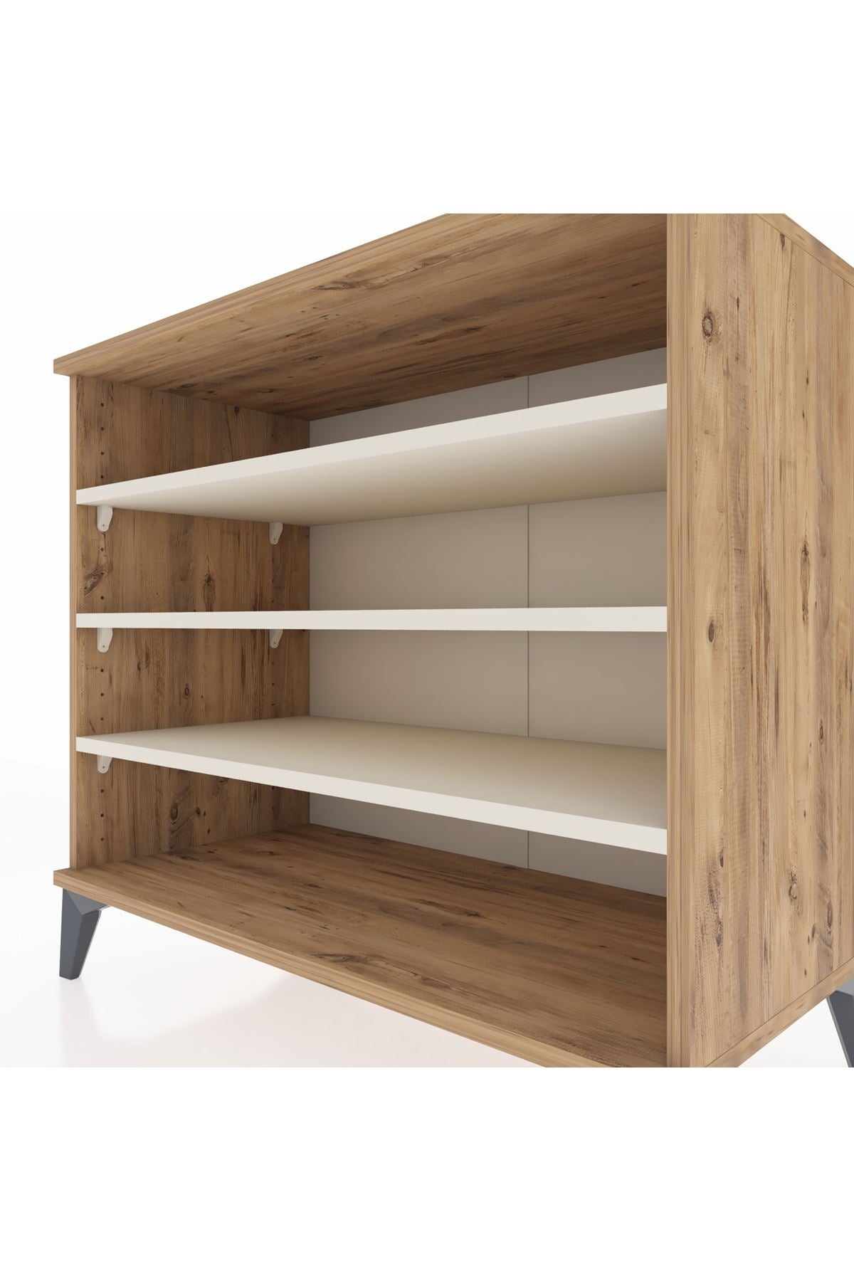 Üç ayarlanabilir raf sayesinde farklı yüksekliklerde kitap, dekoratif kutu veya tekstil ürünleri depolanabilir. Rafların ayarlanabilir olması sezonluk eşyalarınızı veya boyutları değişen aksesuarlarınızı rahatça yerleştirmenizi sağlar. Çekmece sayısı konfigüre edilebilen tasarım, ihtiyacınıza göre ekstra saklama gözleri ekleme veya çıkarma esnekliği verir. Metal ayaklı yapı zeminden hafifçe yükselterek temizlik kolaylığı ve hava sirkülasyonu sağlar. Kompakt ebatları koridor, antre veya yatak odasında yer kazanımı sunar.