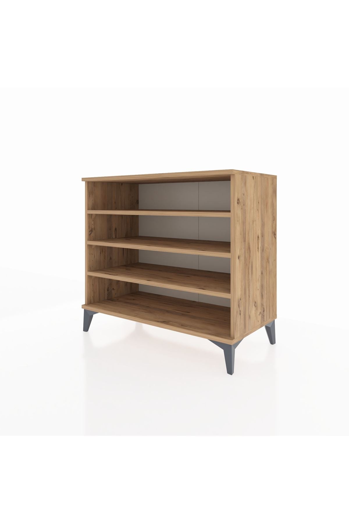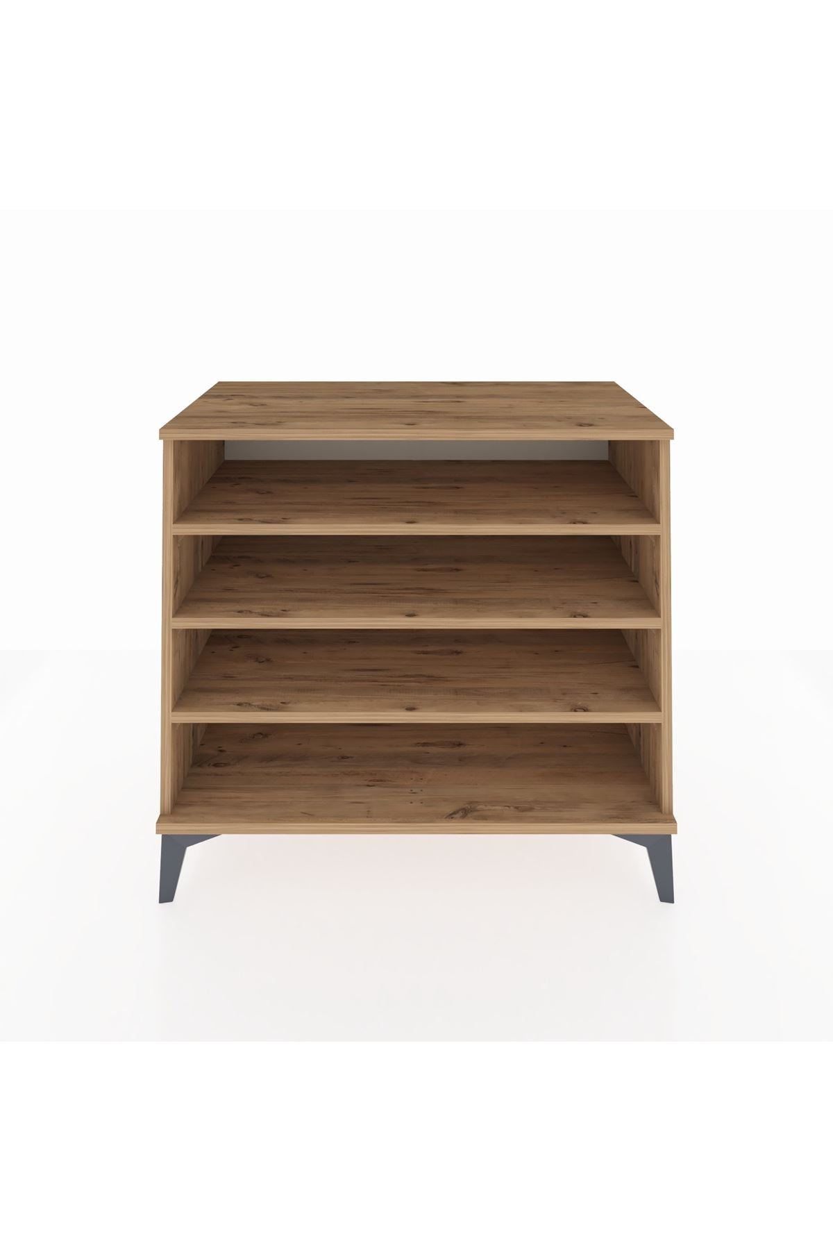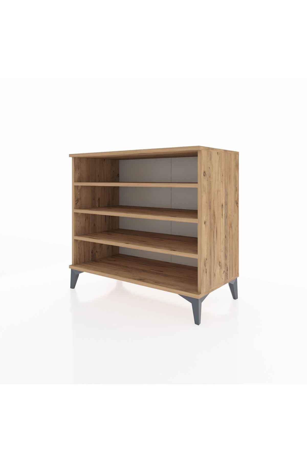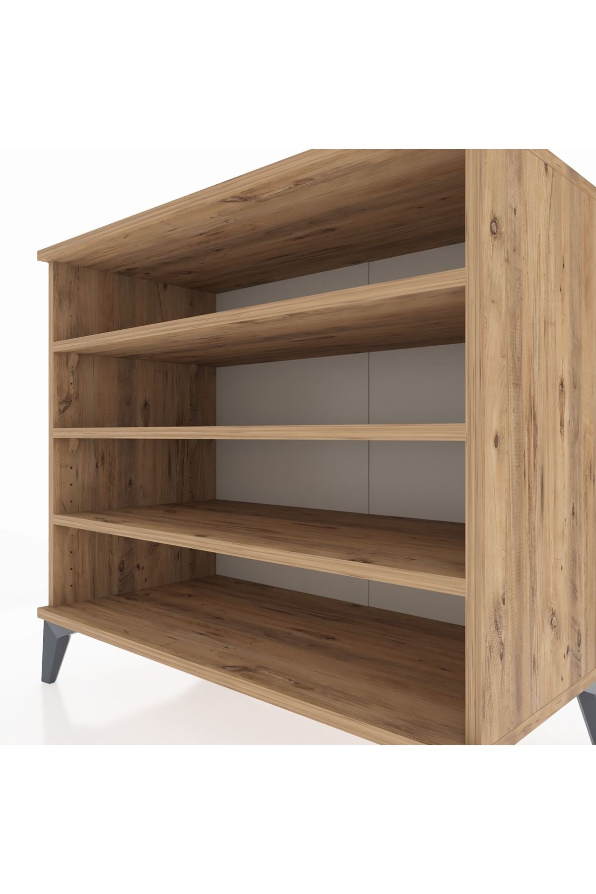Erkek giyim mağazalarında kravat, kemer, çorap ve iç giyim gibi küçük ürünlerin kategorik olarak düzenlenmesine yardımcı olur. Raf yüksekliğinin ayarlanabilir olması, katlanmış gömlek veya pantolon düzenlemesi için fonksiyonel alanlar oluşturur. Metal ayaklar sayesinde alt temizlik kolaydır ve mağaza düzeni hijyenik kalır.