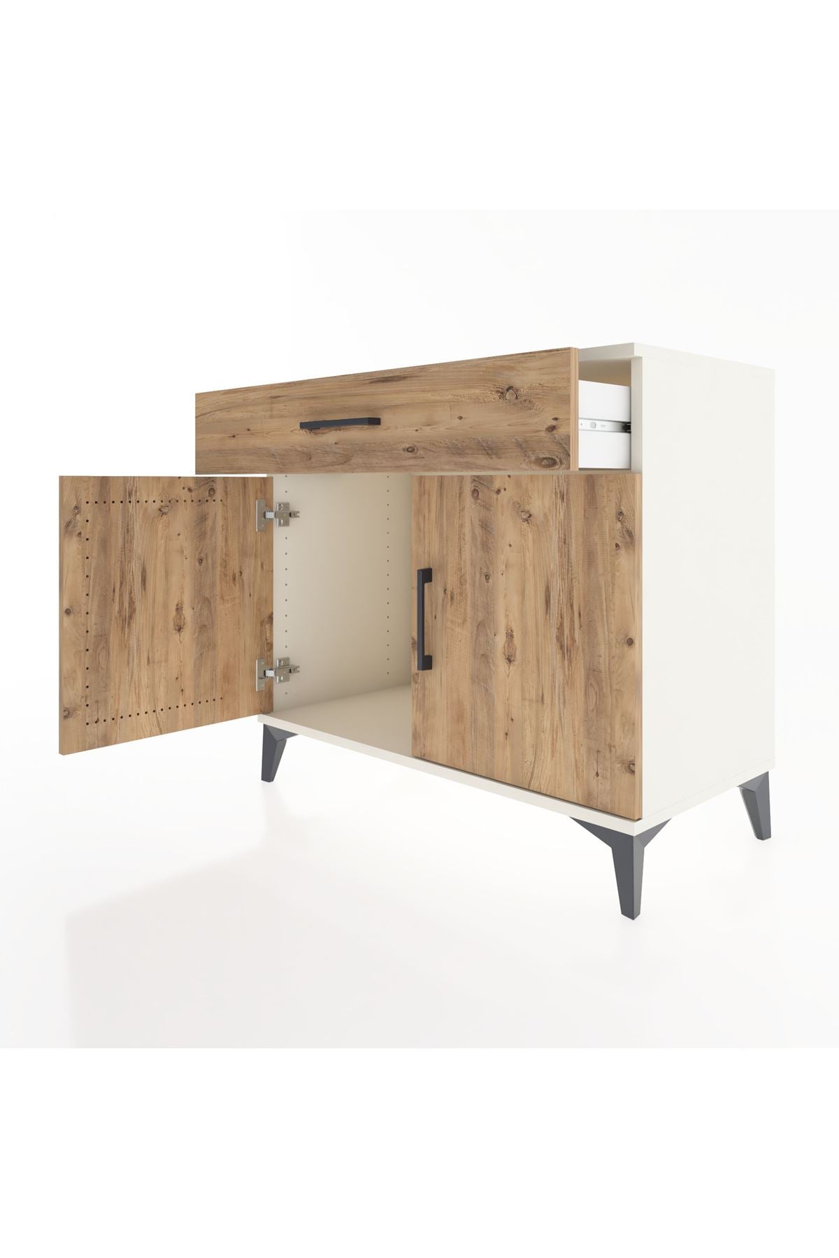 Misafir odasında hem depolama hem de estetik bir tamamlayıcı olarak kullanılabilir. Yedek nevresim, havlu ve konuklara ait küçük eşyalar düzenli şekilde saklanır; üst yüzeyde misafirlerin kullanabileceği su bardağı, lamba veya küçük dekoratif objeler sergilenebilir. Aytaşı rengi ferah bir görünüm, Atlas Çam sıcak bir atmosfer sağlar.