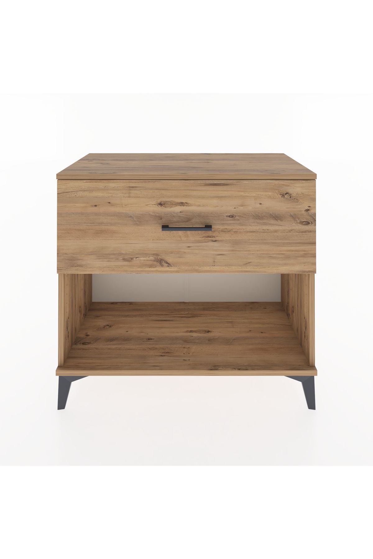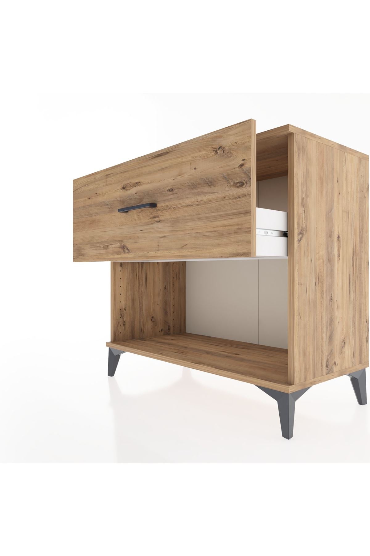 Dar alanlarda maksimum depolama sağlar, hem yüzey hem iç hacim verimliliği sunar. Tek çekmeceli düzeni sık kullanılan eşyalarınızı hızlı erişimle saklamaya uygundur; alt bölüm açık raf olarak ayarlanarak dekoratif saklama veya sepet yerleştirme imkanı verir. Dayanıklı suntalam yüzeyler lekelenmeye karşı dirençli olup temizliği kolaydır. Metal ayaklar zeminden yükseltme sağlayarak nem ve toz birikimini azaltır. Modern hatları ve üç renk seçeneğiyle yatak odası, antre veya ofis gibi farklı odalarda estetik bir bütünlük sağlar.