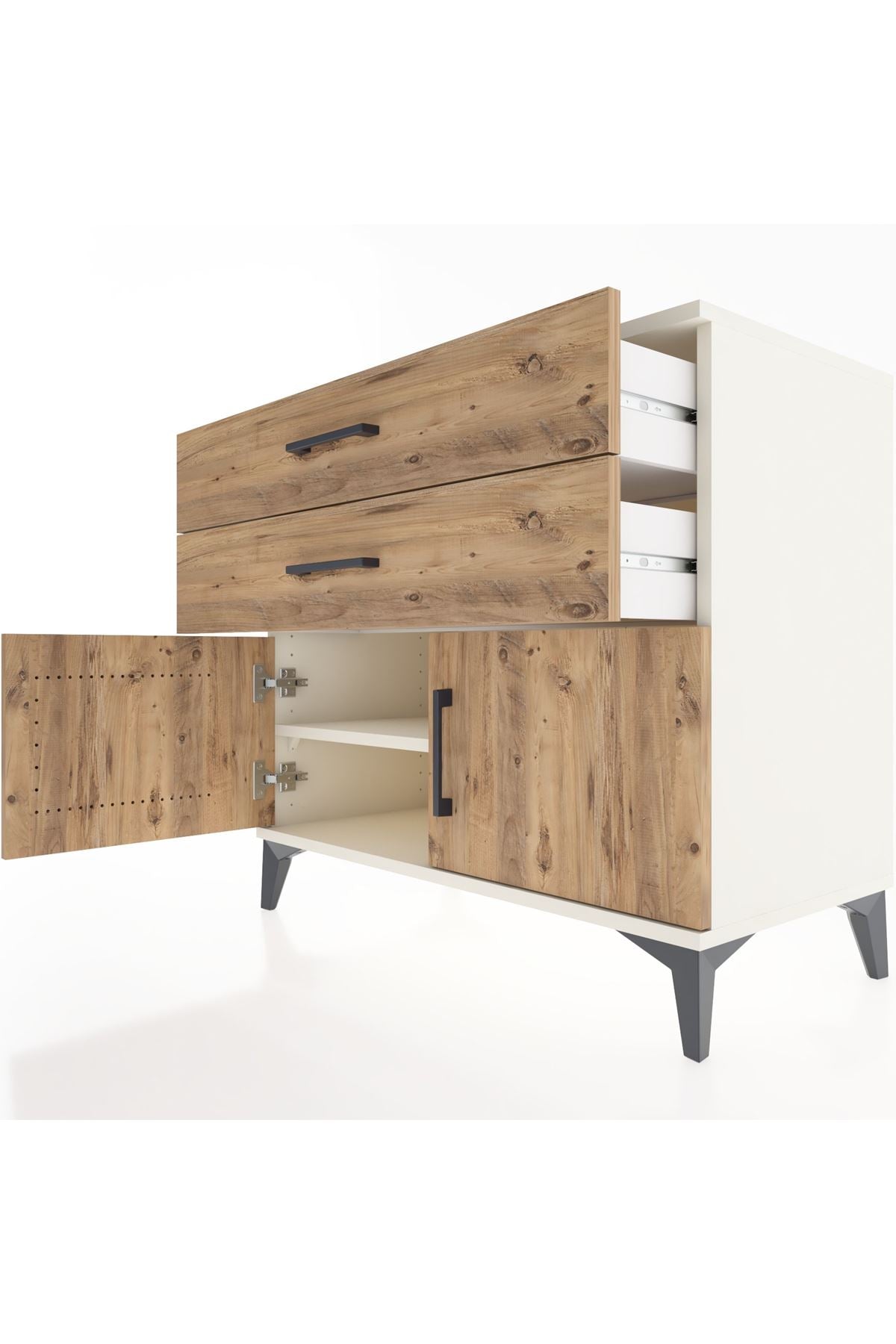 Geniş üst yüzey, sık kullanılan eşyalar için açık kullanım alanı sunar; iki çekmece günlük tekstil ve aksesuar depolaması için idealdir. Alt bölümdeki çift kapaklı bölme, daha büyük hacimli ürünlerin saklanmasına olanak verir. Çekmece sayısı konfigüre edilebilir; ilave çekmece veya farklı düzenleme seçenekleriyle depolama kapasitesi isteğe göre artırılabilir. Metal ayaklar zeminden yükselterek temizlik kolaylığı sağlar, suntalam yüzeyler nem ve lekeye karşı dayanımlıdır. Şarjlı vidalama seti hediye olarak gönderilir, kolay kurulum imkanı verir.
