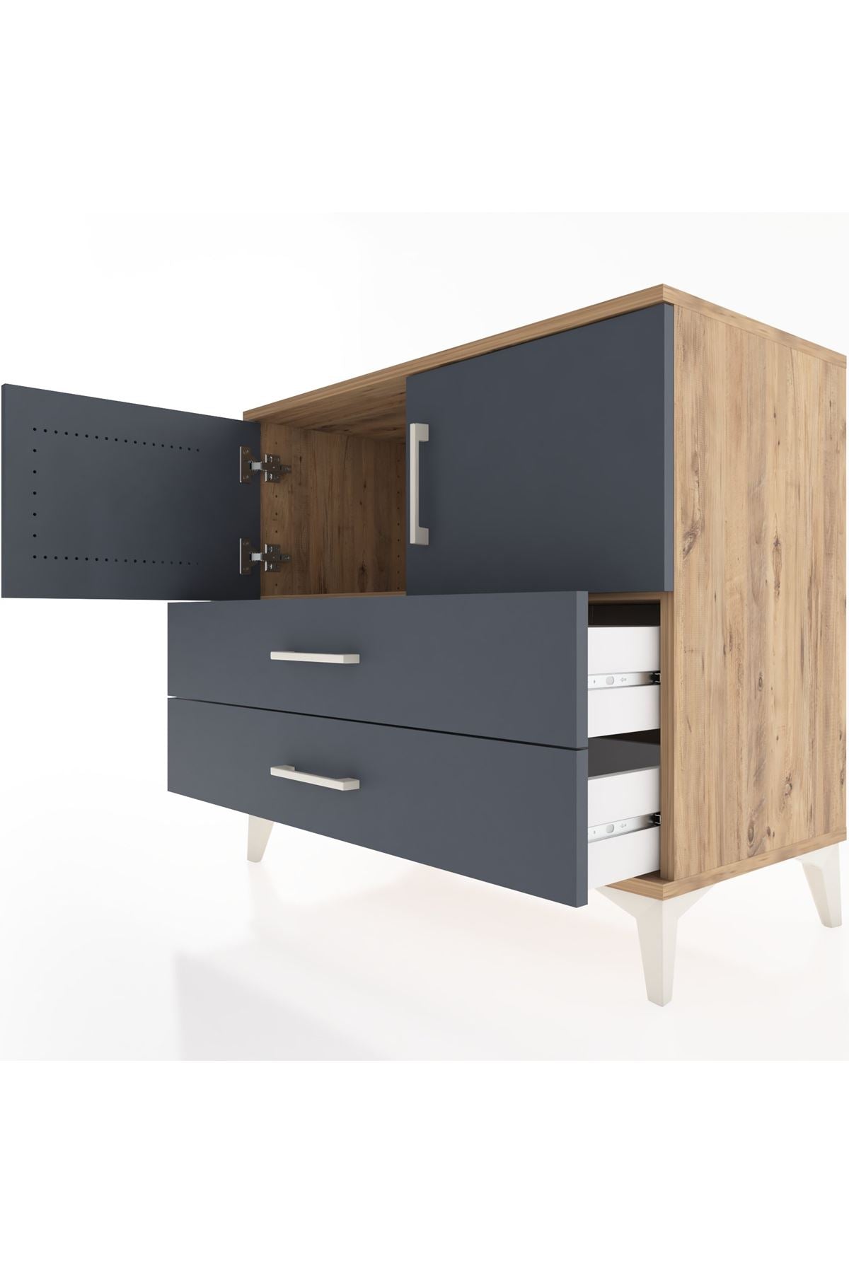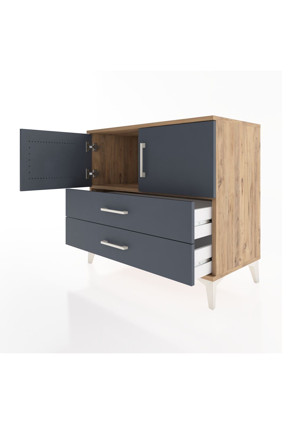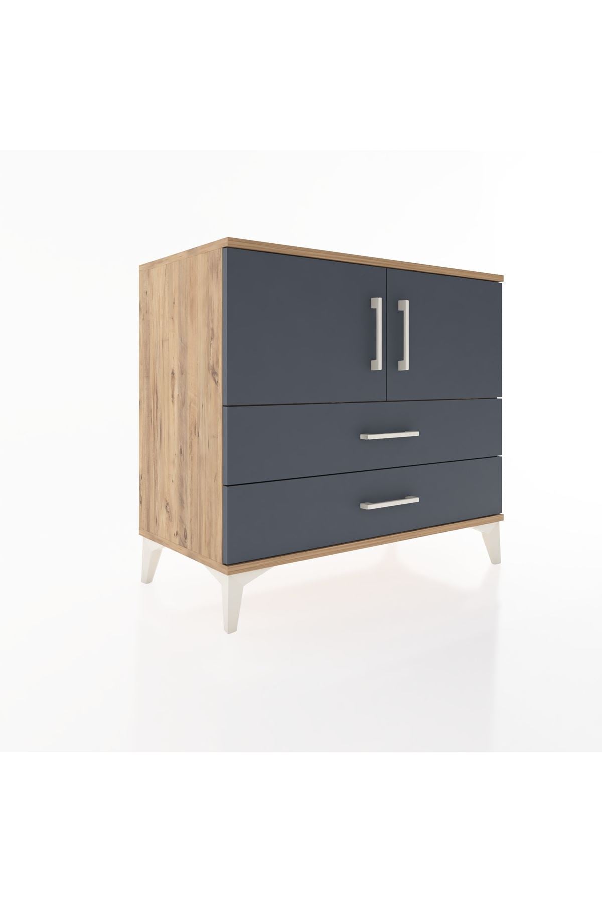 Bu sifonyer, yaşam alanlarında düzeni ve estetiği bir araya getirir. Antrasit gövde ile çam kapak kombinasyonu modern bir kontrast sunar; çizgileri sade, yüzeyleri dayanıklı olacak şekilde tasarlanmıştır. Metal ayaklar zemine sağlam oturur ve ürüne yük taşıma kapasitesi ile stabilite sağlar, metal kulplar ise sık kullanımda uzun ömürlü performans sunacak şekilde üretilmiştir. İçerideki tek raf ayarlanabilir yapıdadır; raf yüksekliği ihtiyaca göre değiştirilebilir, böylece farklı boyutlardaki kutu ve tekstil ürünleri rahatça yerleştirilir.