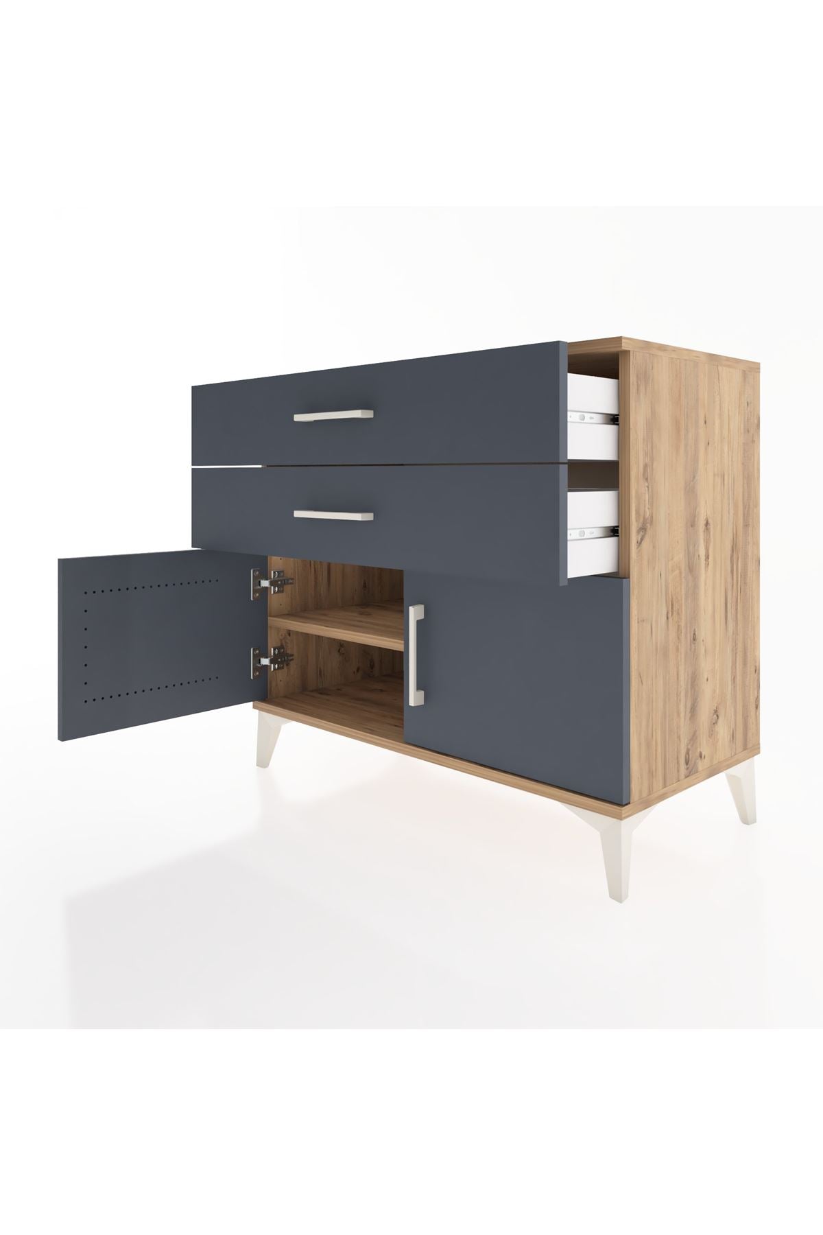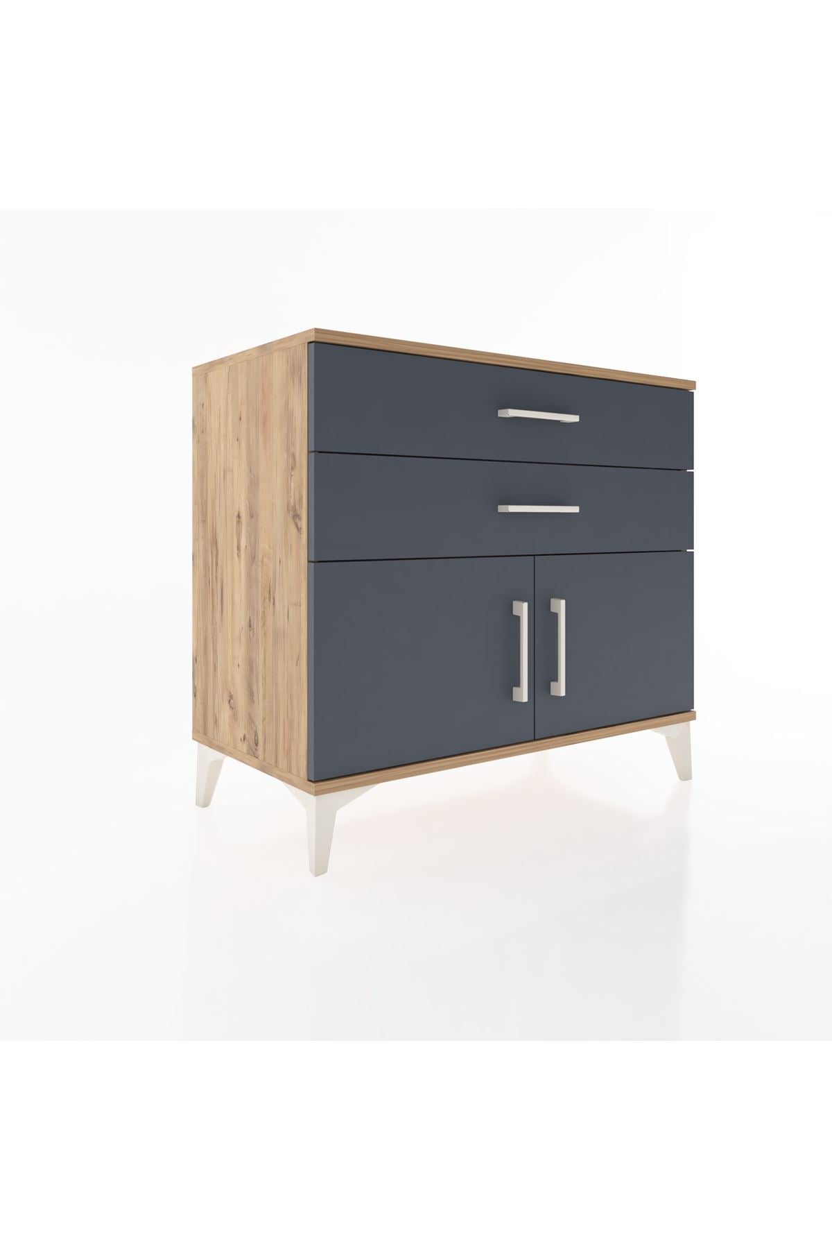 Bu sifonyer, depolama ihtiyaçlarınıza estetik ve düzenli çözümler sunar. Antrasit rengin modern duruşu ve çam kaplamanın sıcak dokusu kombinasyonu yaşam alanlarına sofistike bir hava katar. Metal ayakları sağlam ve dayanıklı, metal kulplar uzun ömürlü kullanım sağlar. Tek raflı iç düzeni sayesinde sık kullanılan eşyalar kolay ulaşılabilir; iki çekmece ve iki kapaklı alt bölme kombinasyonu küçük eşyalar ile katlanmış tekstiller için ideal depolama düzeni oluşturur.