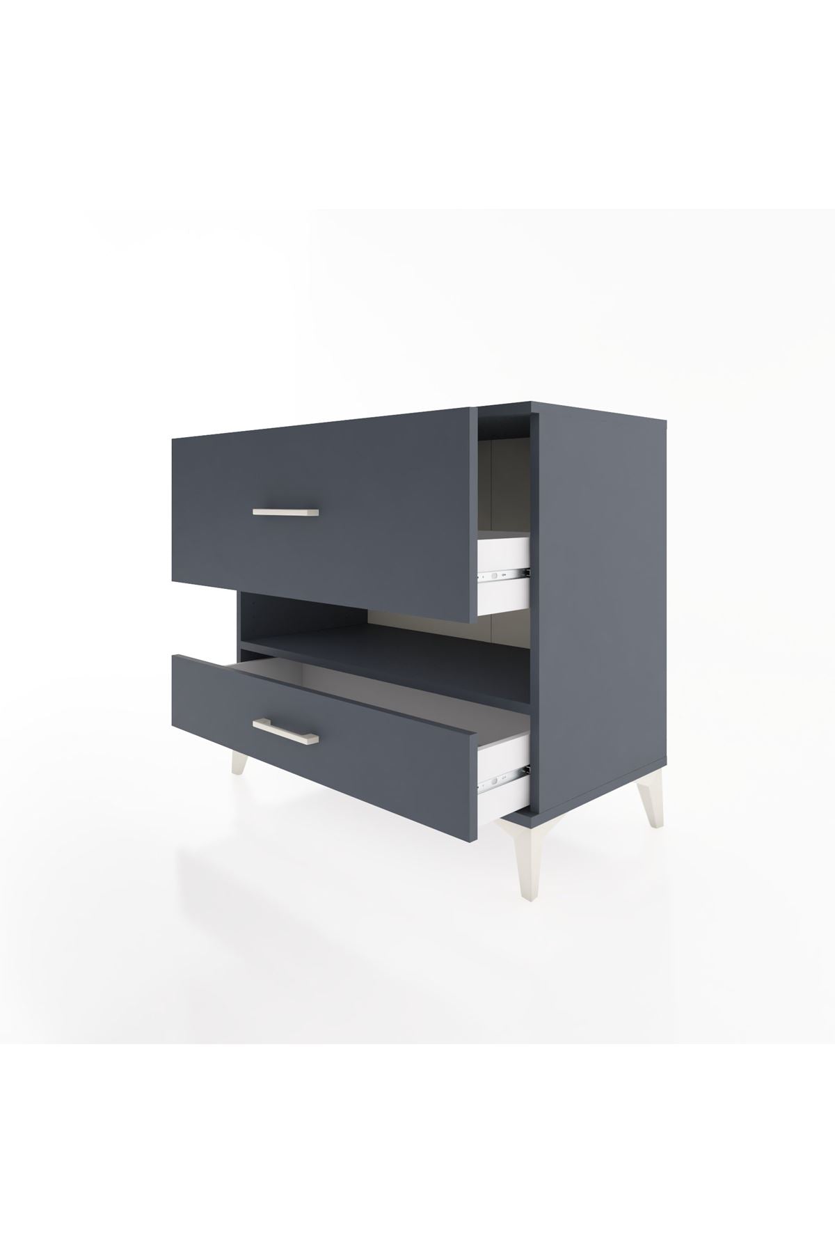 Bu sifonyer, evinizde düzen ve estetik sağlar. Antrasit tonundaki mat yüzey modern ve sofistike bir hava katarken, keskin hatları mekâna çağdaş bir karakter getirir. Metal ayaklar sağlamlık ve yük taşıma kapasitesi sunar; metal kulplar ise uzun ömürlü kullanım ve konforlu çekmece açma deneyimi sağlar. Tek raflı iç düzen, pratik erişim ve sergileme imkânı verir. Raflar ayarlanabilir olup, farklı yükseklik ihtiyaçlarına göre kolayca konumlandırılabilir. Çekmece sayısı konfigüre edilebilir; ekstra düzenleme için ek çekmece seçenekleriyle kullanımı kişiselleştirebilirsiniz.