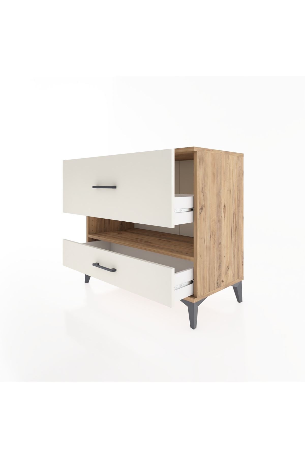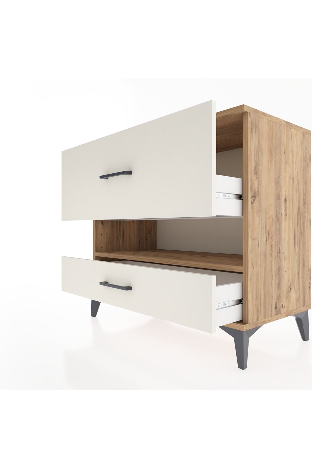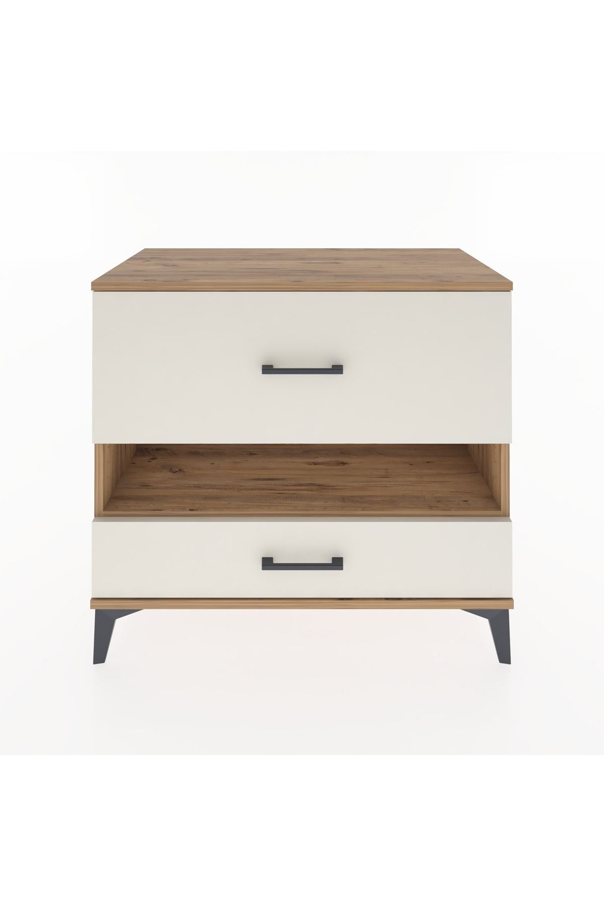 Geniş üst yüzey günlük kullanım için dekoratif objeler, ayna veya şık bir lamba yerleştirmeye uygundur. Ortada konumlandırılmış tek raf, sık kullanılan eşyaları hızlıca erişilebilir kılar; raflar ayarlanabilir olduğu için depolama düzeni ihtiyaca göre kolayca değiştirilebilir. İki çekmece sayesinde katlanmış giysi, iç çamaşırı veya kişisel aksesuarlar düzenli saklanır; çekmece sayısı konfigüre edilebilir olması farklı depolama ihtiyaçlarına uyum sağlar. Metal donanımlar, sık kullanımda bile stabilite ve sorunsuz açılıp kapanma performansı sağlar.