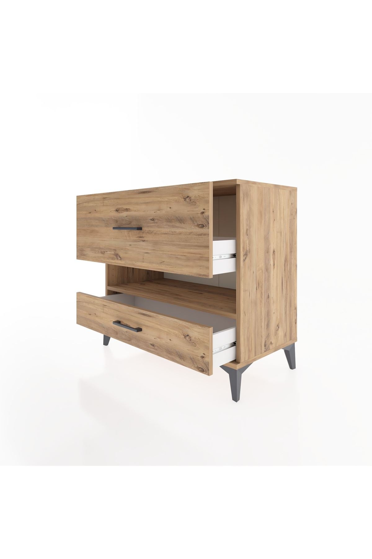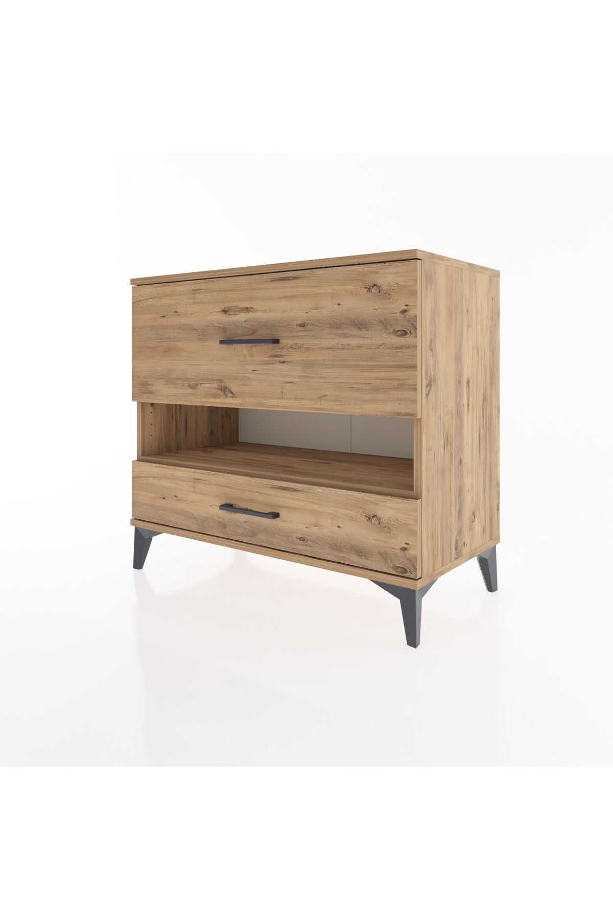 Çift çekmece ve tek açık raf düzeni sayesinde kıyafet, aksesuar ve küçük eşyalar ayrı ayrı saklanabilir. Ayarlanabilir raflar ile depolama yüksekliği kişiselleştirilebilir; mevsimsel kıyafet veya hacimli eşyalar için iç düzen hızlıca değiştirilebilir. Üst yüzeyi dekoratif objeler, ayna veya teşhir ürünleri için sağlam bir alan sunar. Metal donanımlar, yoğun kullanımda bile stabilite ve rahatsız edici aşınma riskini azaltır.