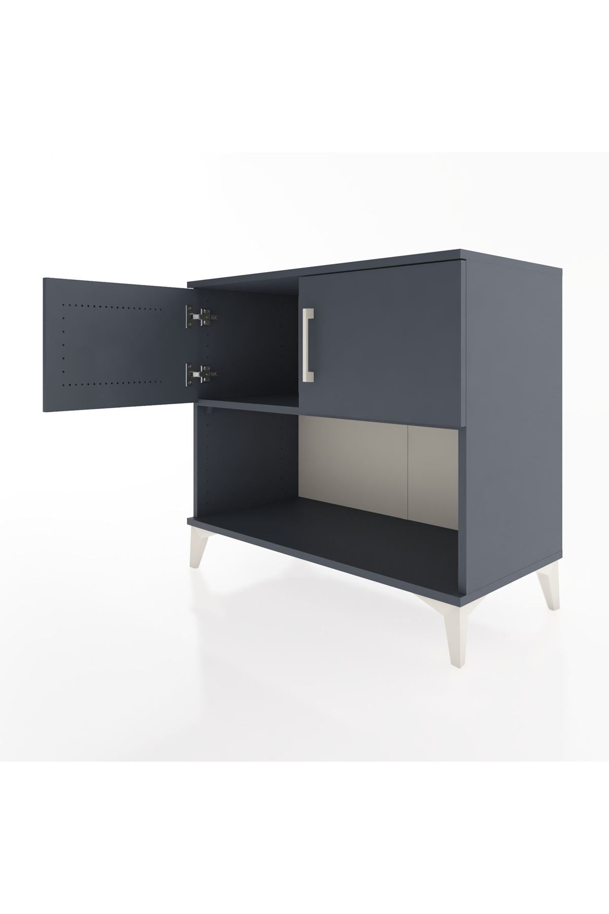 Bu sifonyer, evinizde düzen ve estetik sağlar. Antrasit rengi modern ve sofistike bir görünüm sunar; temiz yüzey hatları ve nötr tonu ile farklı dekorasyon stilleriyle uyum sağlar. Metal ayaklar ürünün taşıma kapasitesini ve stabilitesini artırır, metal kulplar ise günlük açma kapanma işlemlerinde uzun ömürlü kullanım sunar. Üst bölümde iki kapaklı saklama alanı, alt bölümde tek ayarlanabilir raf ile sık kullanılan eşyalarınızı kolayca yerleştirmenize imkân tanır. Raflar ayarlanabilir; iç düzeni kendi ihtiyaçlarınıza göre şekillendirebilirsiniz. Çekmece sayısı konfigüre edilebilir, ek çekmece seçenekleriyle depolama kapasitesi genişletilebilir.
