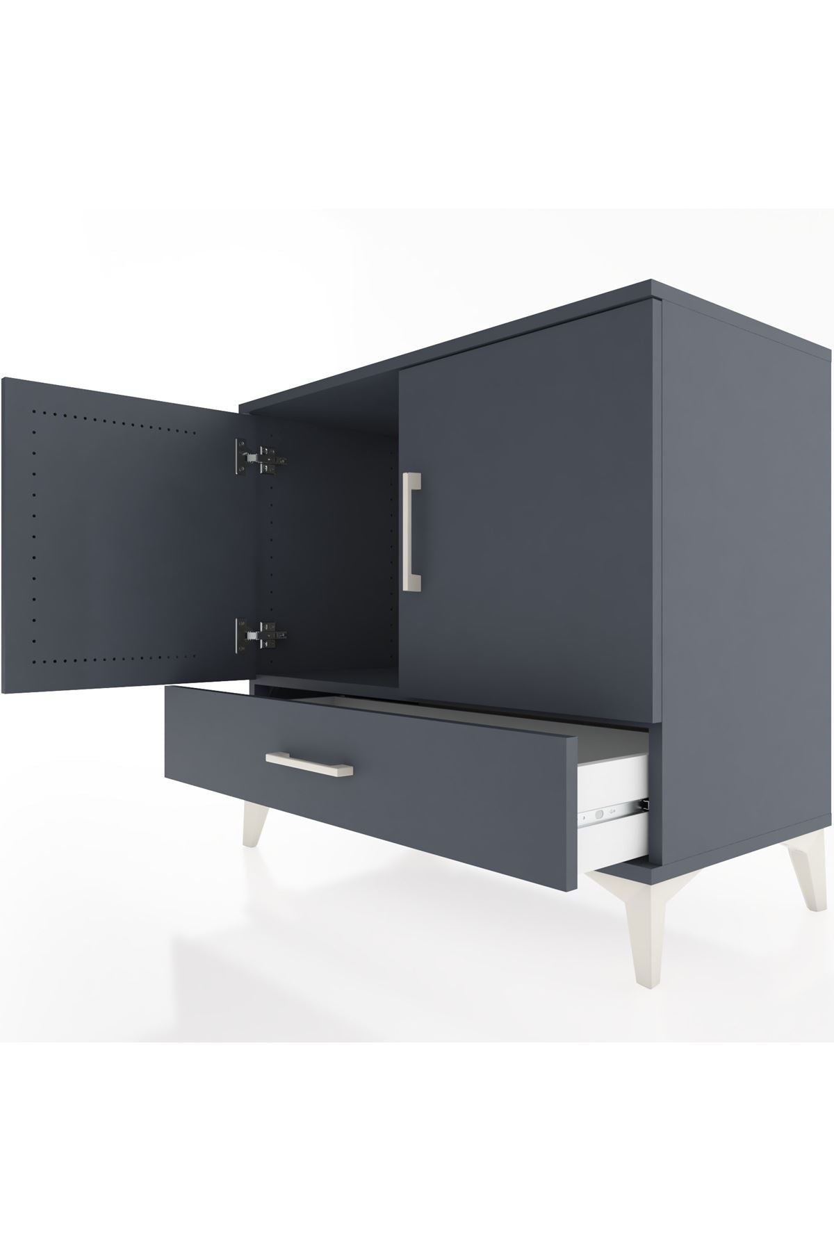 Bu sifonyer, evinizde düzen ve estetiği aynı anda sunar. Antrasit renk seçeneği modern ve dengeli bir atmosfer yaratırken düz yüzeyleri ve temiz hatlarıyla farklı dekor stilleriyle uyum sağlar. Metal ayaklar ürüne sağlamlık ve yük taşıma kapasitesi kazandırır; metal kulplar ise uzun ömürlü kullanım ve kolay açma-kapama deneyimi sunar. İç kısmında yer alan tek raf ayarlanabilir yapıda olup saklama ihtiyacınıza göre farklı yüksekliklerde konumlandırılabilir. Tek çekmece temel eşyalarınızı düzenli biçimde saklamaya uygundur; dilerseniz çekmece sayısı konfigüre edilebilir, kullanım alanınıza göre ek çekmece seçenekleri ile özelleştirme yapılabilir.