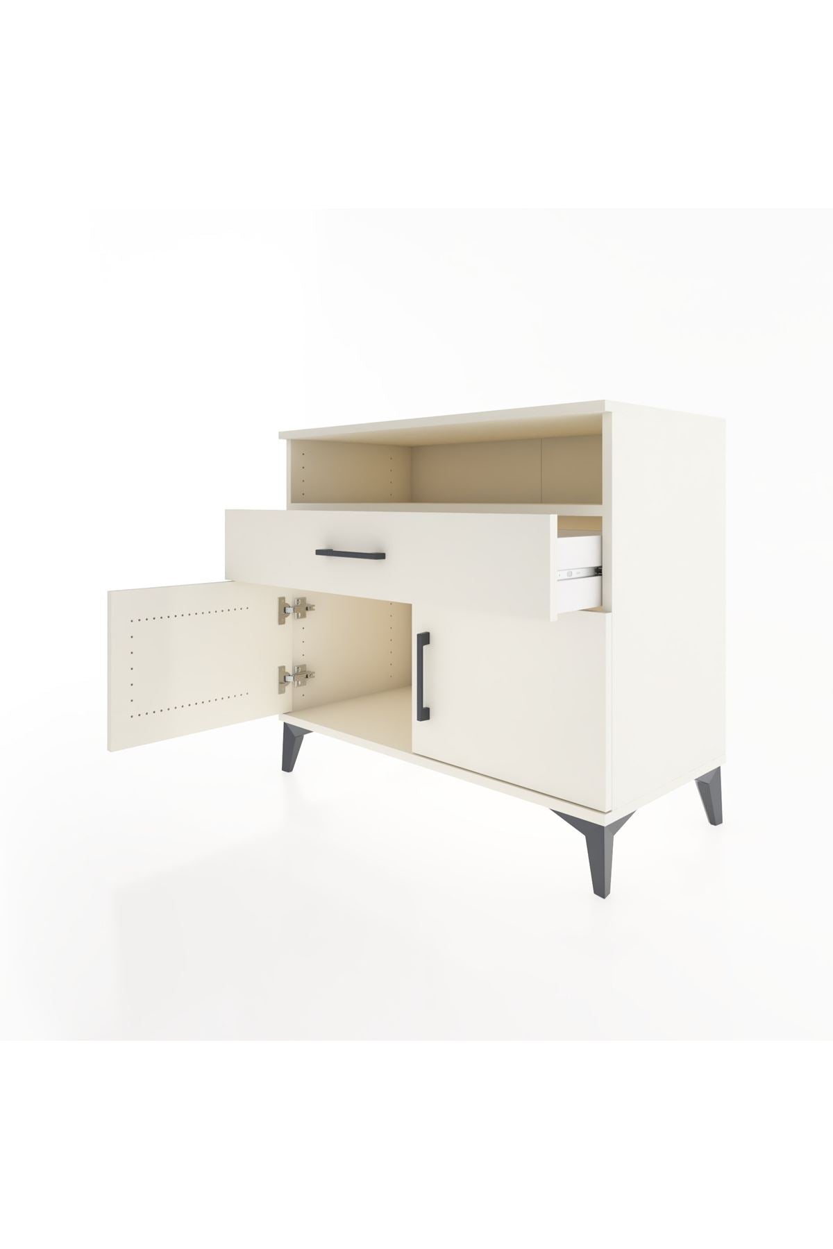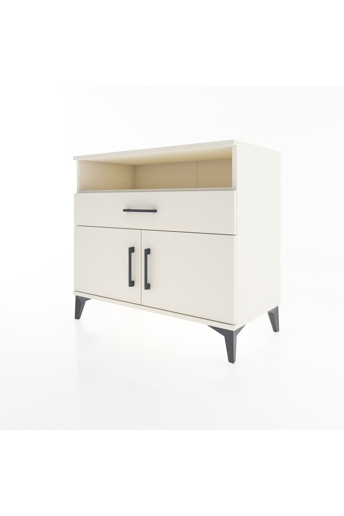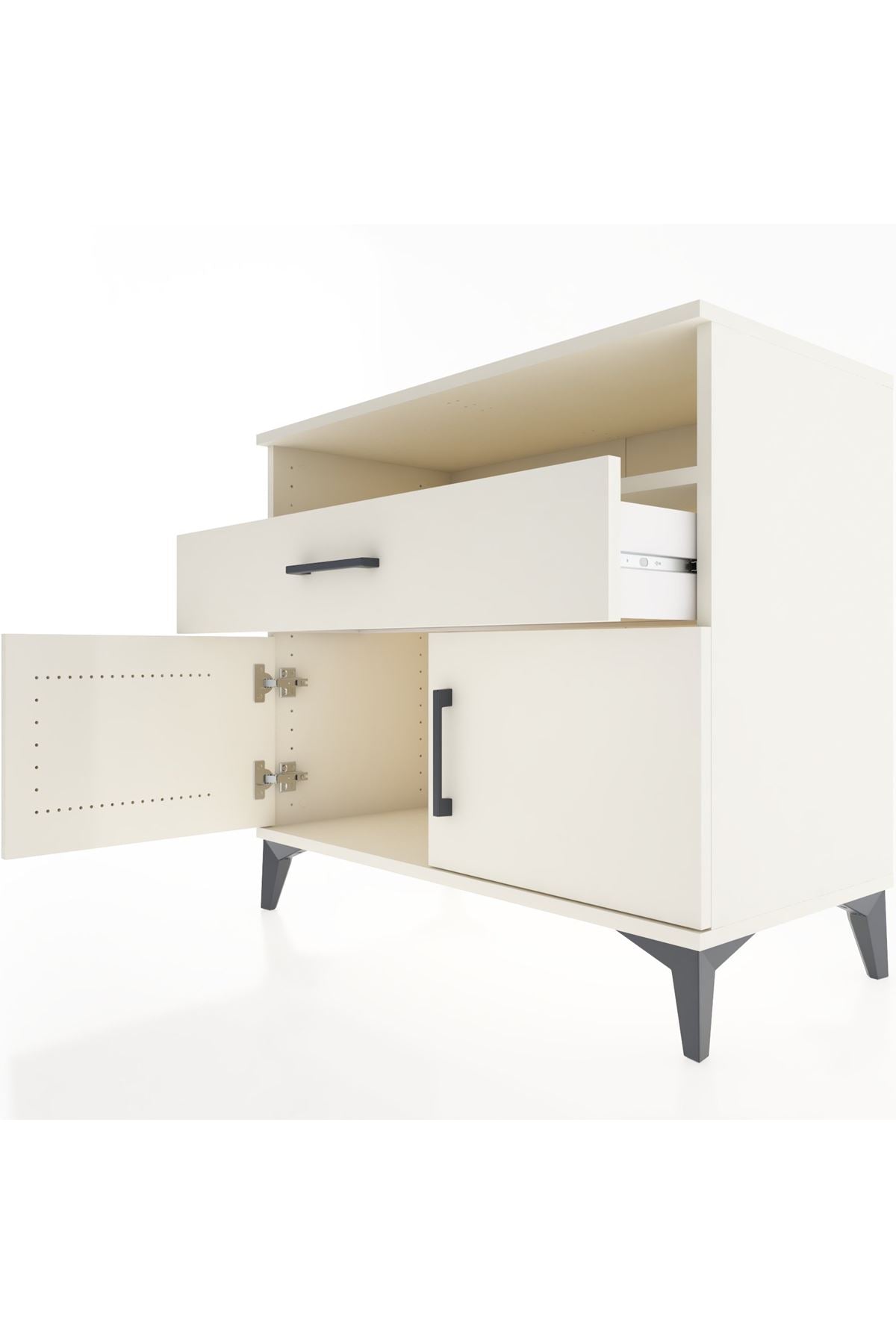 Geniş üst raf günlük kullanım eşyalarını, elektronik cihazları veya dekoratif objeleri düzenlemenize yardımcı olur; açık raf, sık erişilen malzemeleri kolayca ulaşılabilir kılar. Tek çekmece, küçük aksesuar, kablo ve kişisel eşyalar için düzenli saklama sağlar; çekmece içi düzenleyicilerle modüler kullanım mümkündür. İki kapaklı alt bölüm daha büyük parçaların, klasörlerin veya kıyafetlerin düzenli depolanmasına uygundur. Raflar ayarlanabilir olduğu için saklama yüksekliğini ihtiyaca göre optimize edebilirsiniz. Metal ayaklar zeminden yükseklik sağlayarak temizlik ve nem kontrollü kullanım imkânı verir, aynı zamanda mobilyaya modern bir hava katar.