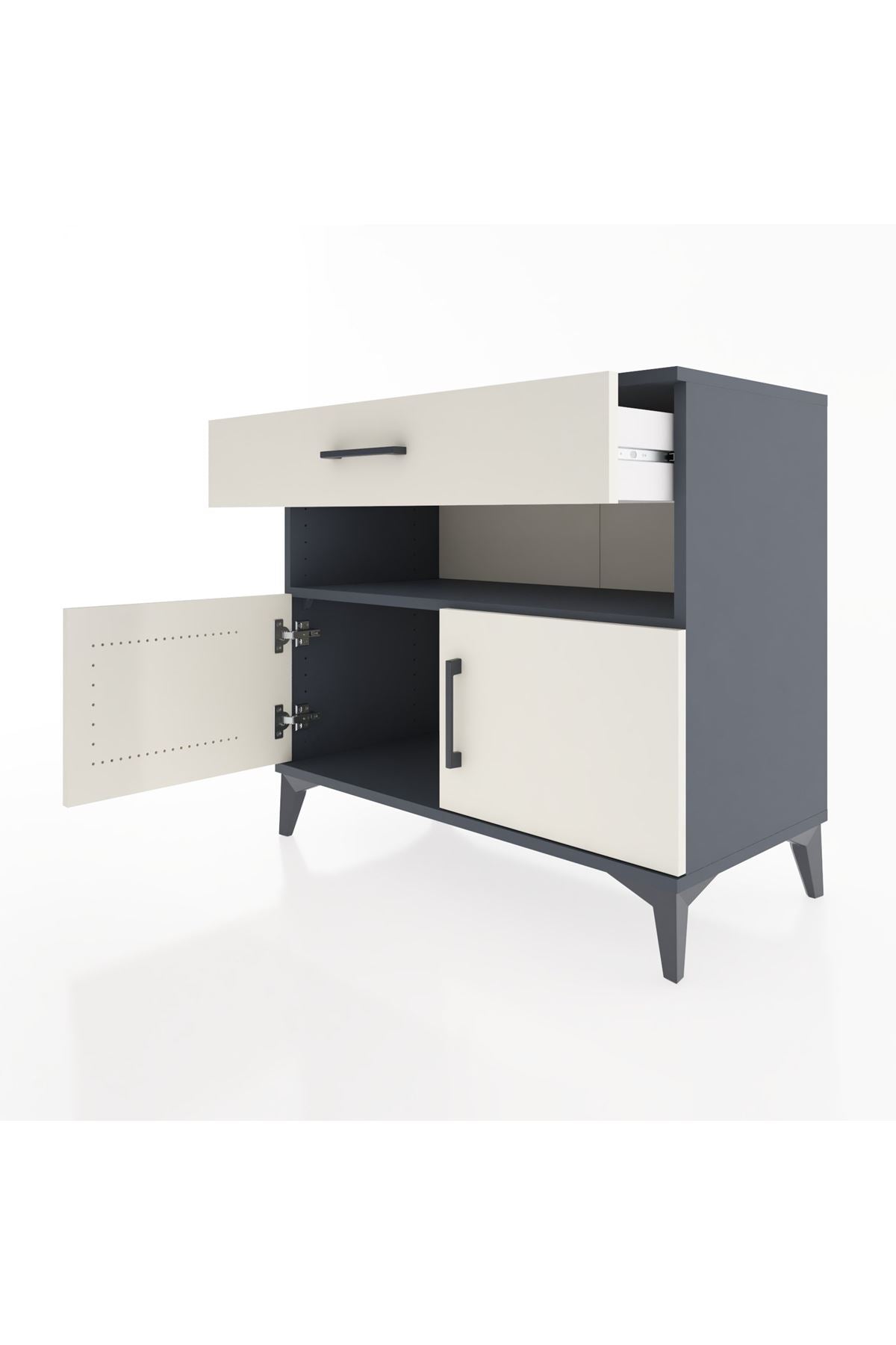 Bu sifonyer, evinizde düzenli ve erişilebilir depolama alanı sağlar. Antrasit-Aytaşı kombinasyonu modern kontrast oluşturarak sade ve zarif bir estetik sunar. Metal ayakları sağlam ve dayanıklı, metal kulplar uzun ömürlü kullanım sunar. Raflar ayarlanabilir, çekmece sayısı konfigüre edilebilir; böylece ihtiyaçlara göre düzenleme yapılabilir.