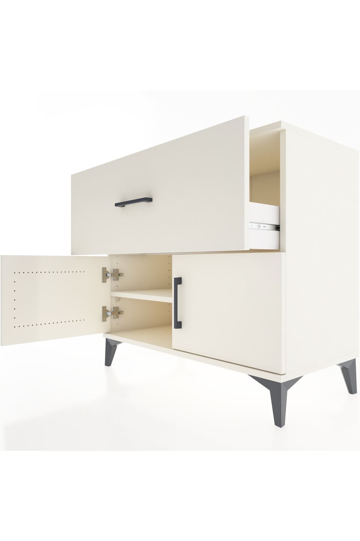 Dar alanlarda maksimum depolama sunar; tek çekmecesi ile sık kullanılan eşyalarınızı hızlıca ulaşılır tutar, alttaki iki kapaklı bölümde büyük ebatlı tekstil ve eşyalar düzenli şekilde saklanır. Ayarlanabilir raf sistemi sayesinde kullanım ihtiyaçlarına göre yükseklik ayarı yapabilir, çekmece sayısını konfigüre ederek kişisel depolama tercihlerinize uyum sağlayabilirsiniz. Metal ayak tasarımı zeminin temizliğini kolaylaştırırken mobilyanın daha uzun süre nemden uzak kalmasına yardımcı olur.