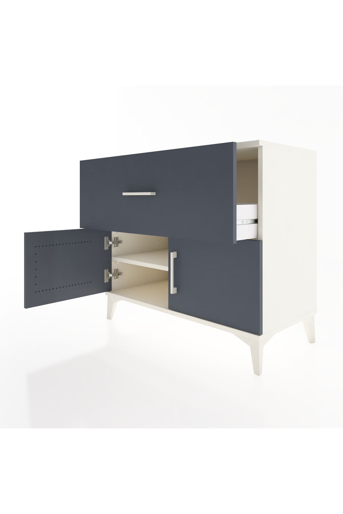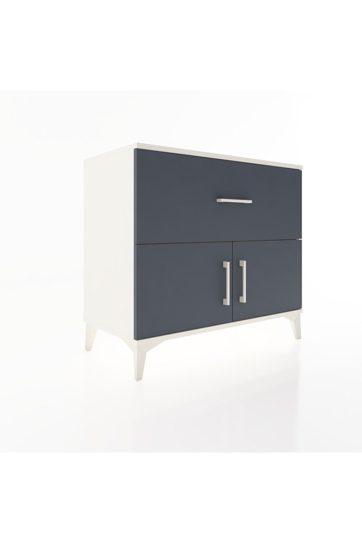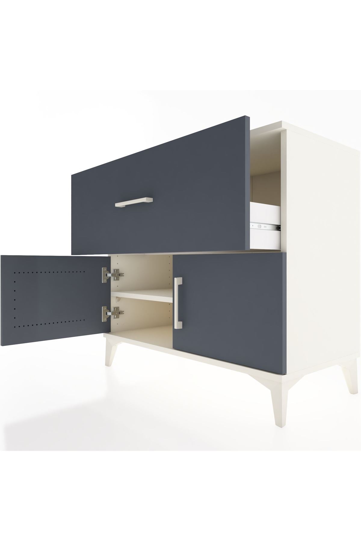 Tek raflı yapısı sayesinde eşyalarınızı kategorize ederek yerleştirmenize imkan tanır; raflar ayarlanabilir olduğu için depolama yüksekliğini ihtiyaca göre değiştirebilirsiniz. Tek çekmeceli üst bölme sık kullanılan küçük eşyalar için kolay erişim sağlar, alt bölümdeki iki kapaklı alan ise daha büyük eşyaları ve düzenli saklamayı mümkün kılar. Çekmece sayısı konfigüre edilebilir; ekstra çekmece talebiyle farklı kullanım senaryolarına uyum sağlar. Metal ayaklı tasarım zeminden yükselterek temizlik ve hava akışını kolaylaştırır, ayrıca mobilyanın genel sağlamlığını artırır.