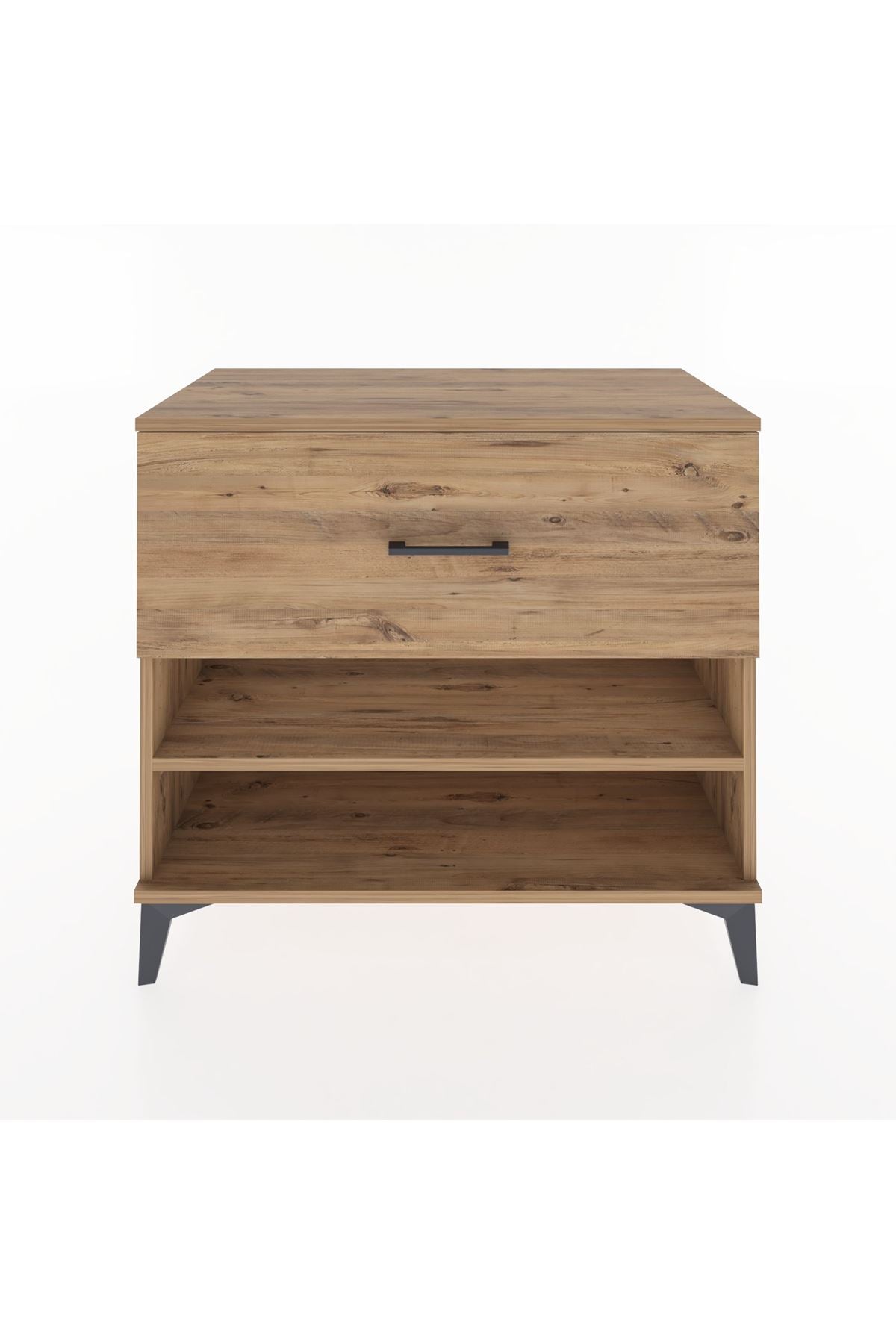 Dar alanlarda bile maksimum depolama sunar; yatak odası ve giriş alanlarında düzen sağlar. Açık raf alanı kitap, dergi ve dekoratif eşyalar için ideal depolama imkânı verir. Tek çekmece içindeki bölme seçenekleri ile küçük tekstil, aksesuar ve elektronik aletleri güvenle saklayabilirsiniz. Montaj kolaylığı ve hediye edilen şarjlı vidalama seti sayesinde kurulumu hızlıdır; sağlam konstrüksiyonu uzun süreli kullanım garantiler.