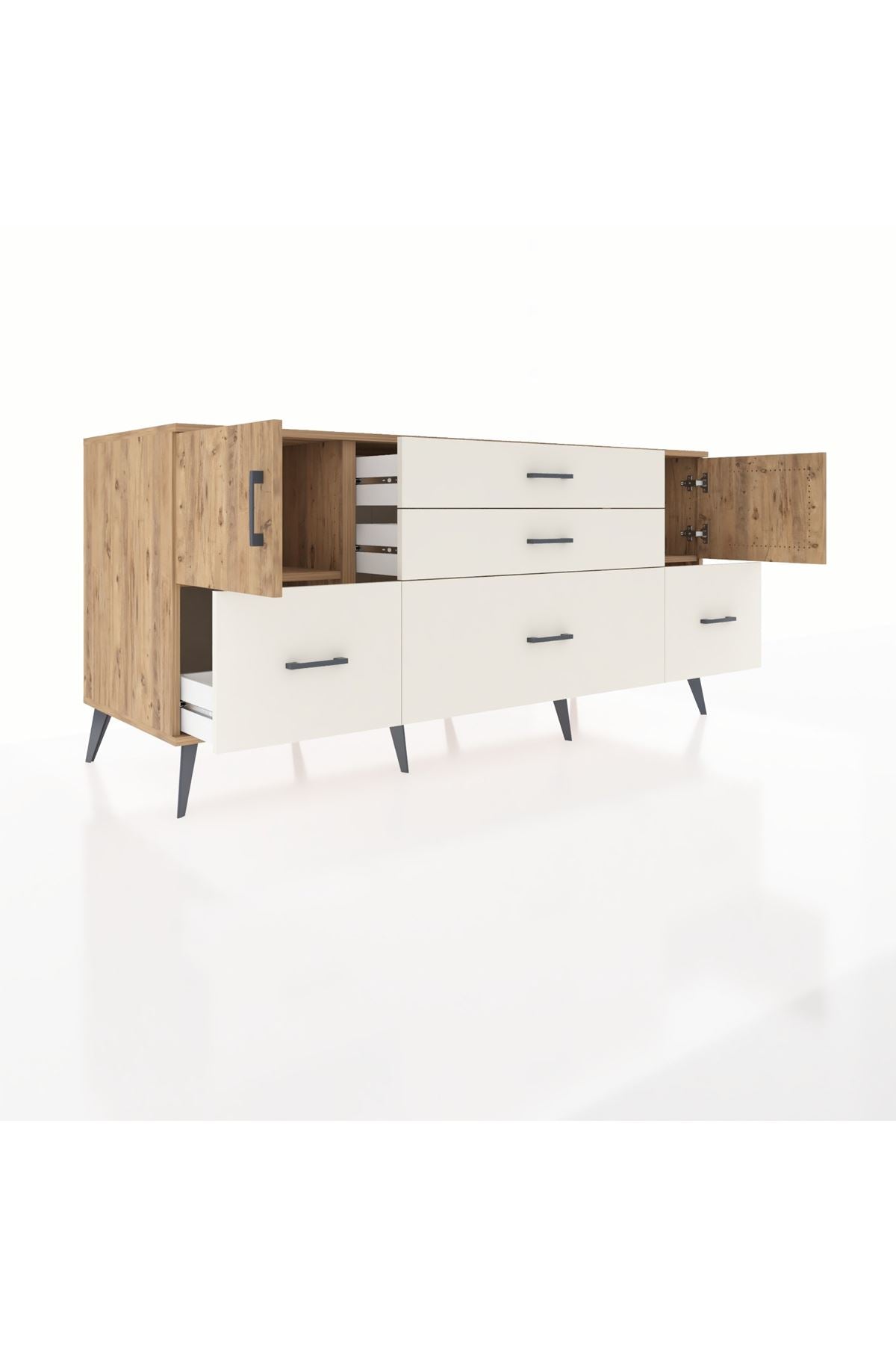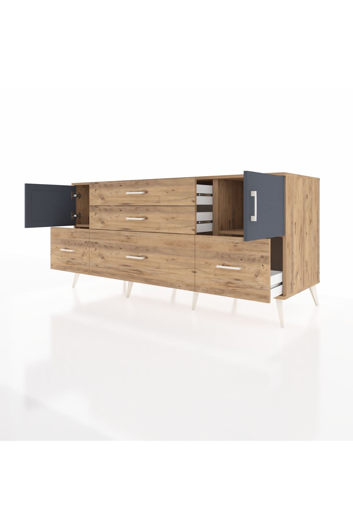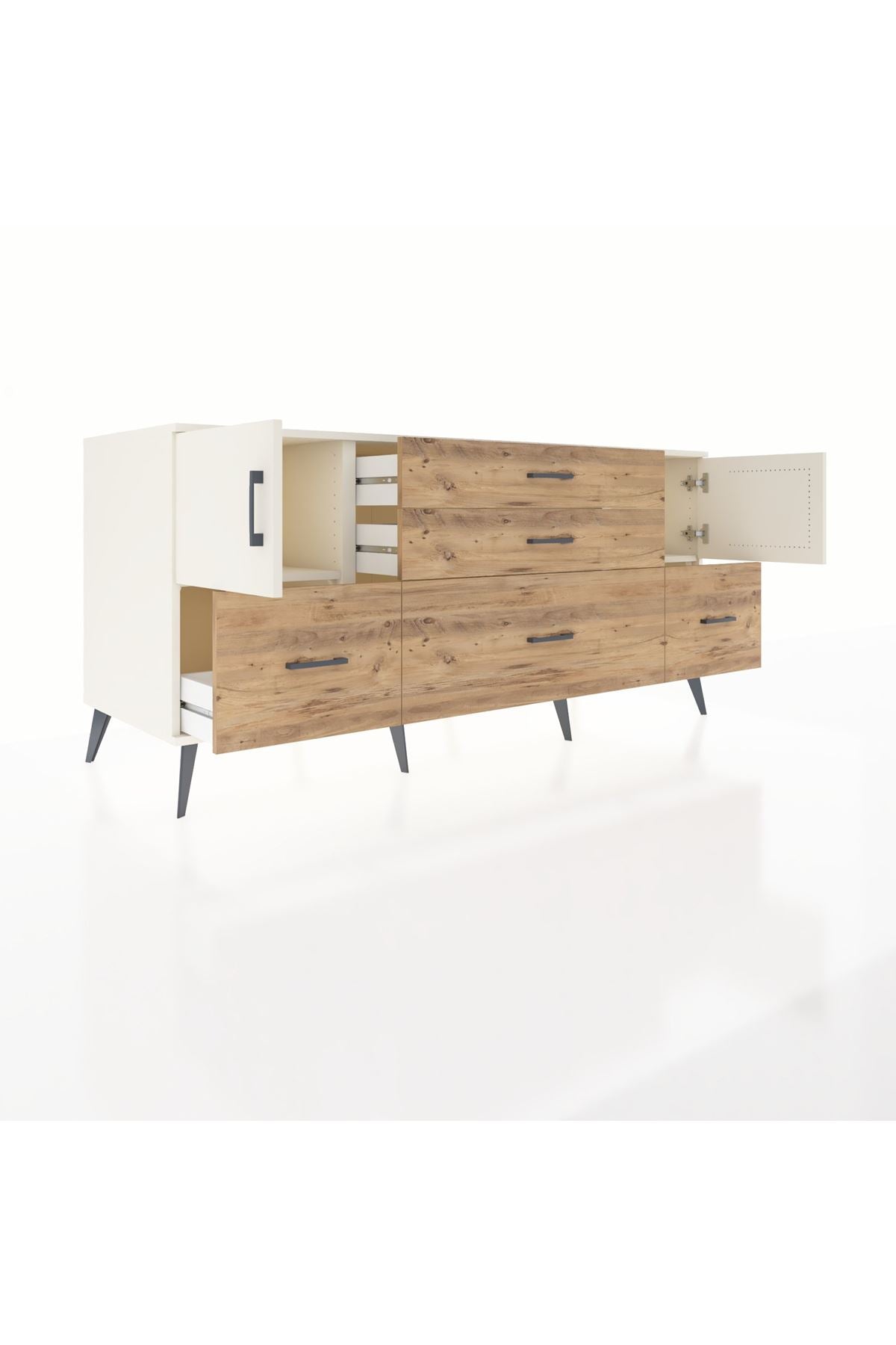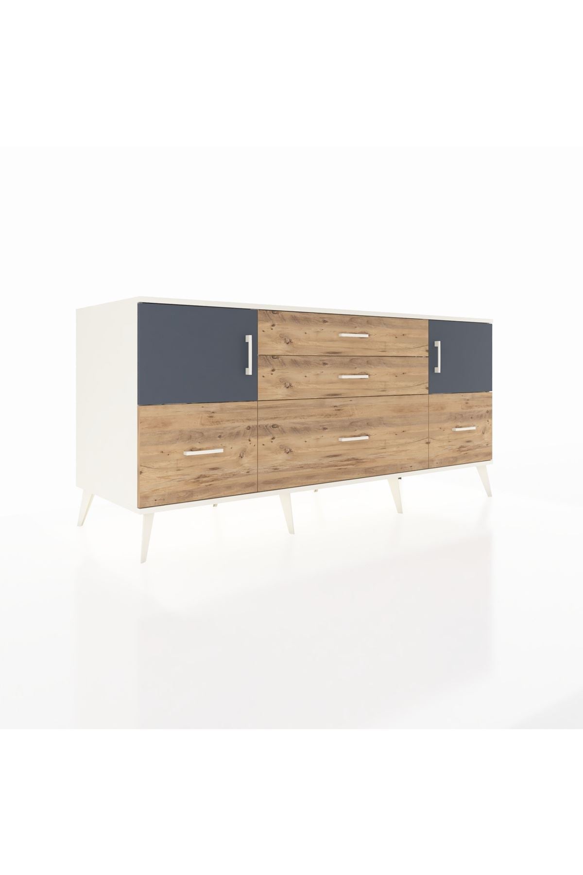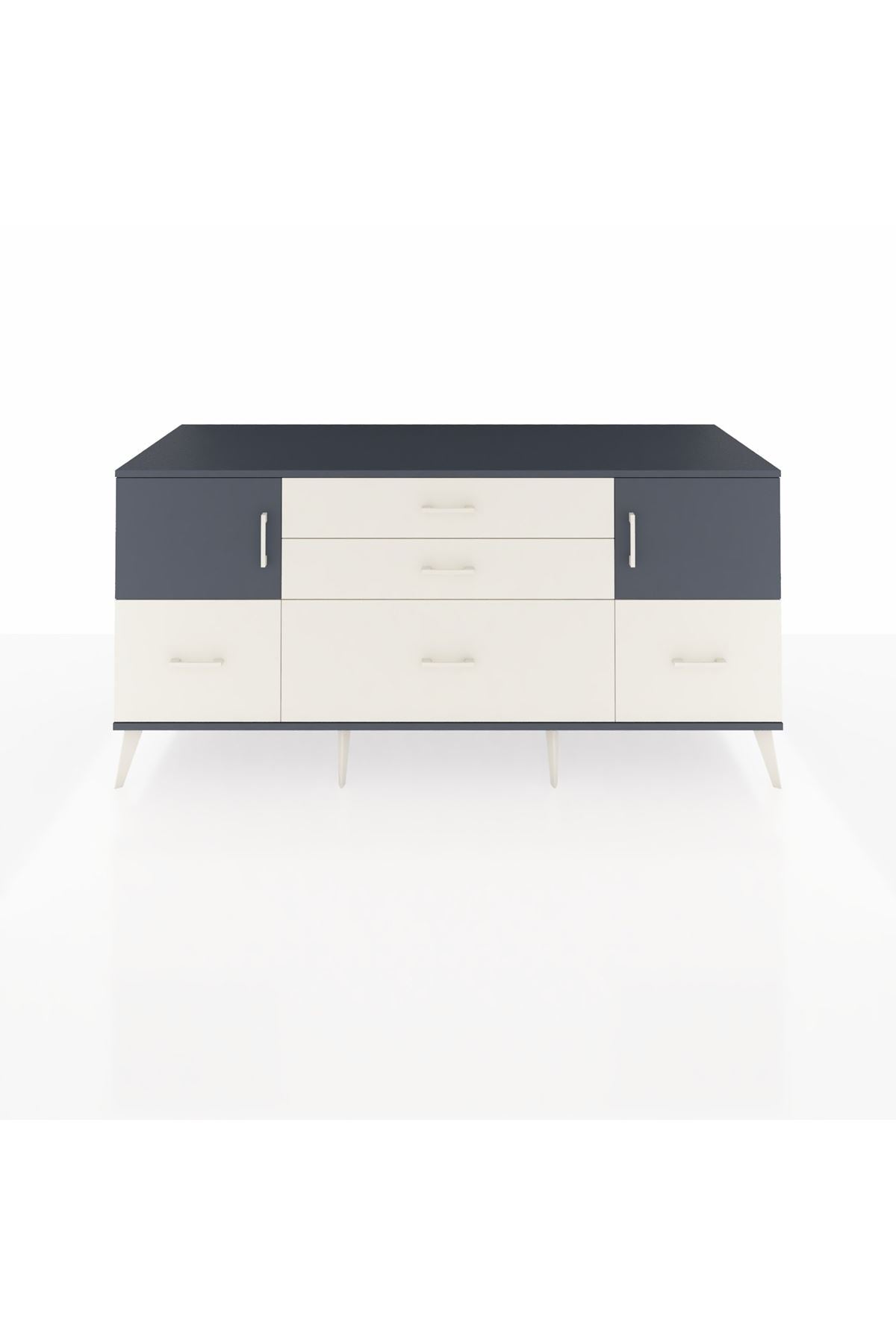 Kronos Konsol 2 Raflı 5 Çekmeceli 2 Kapaklı, yatak odası, oturma odası, çalışma odası, antre veya giyinme odası gibi birçok farklı alanda kullanılabilir. Şık tasarımı ve fonksiyonel yapısıyla evinize kolayca uyum sağlar.