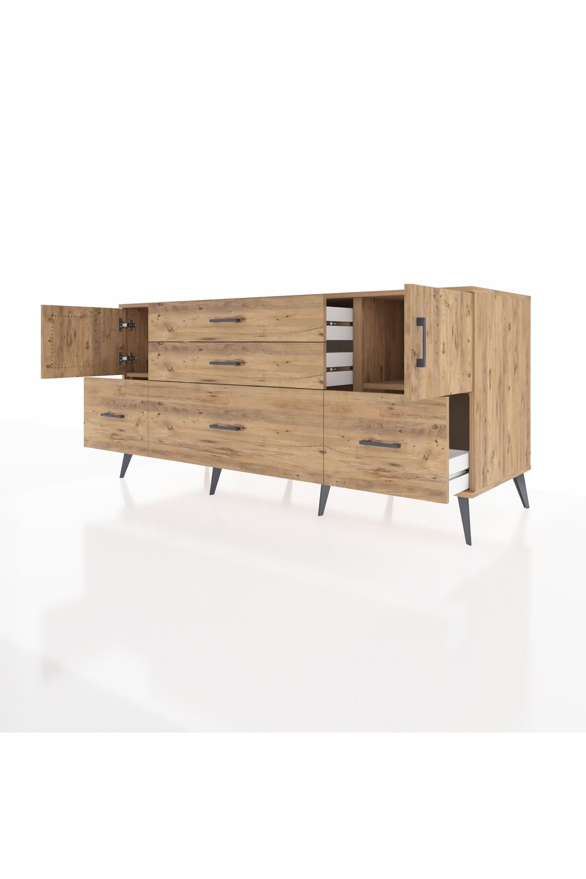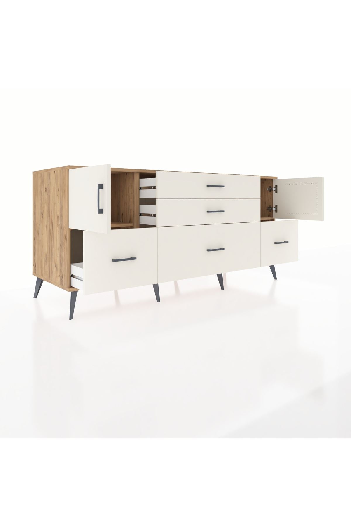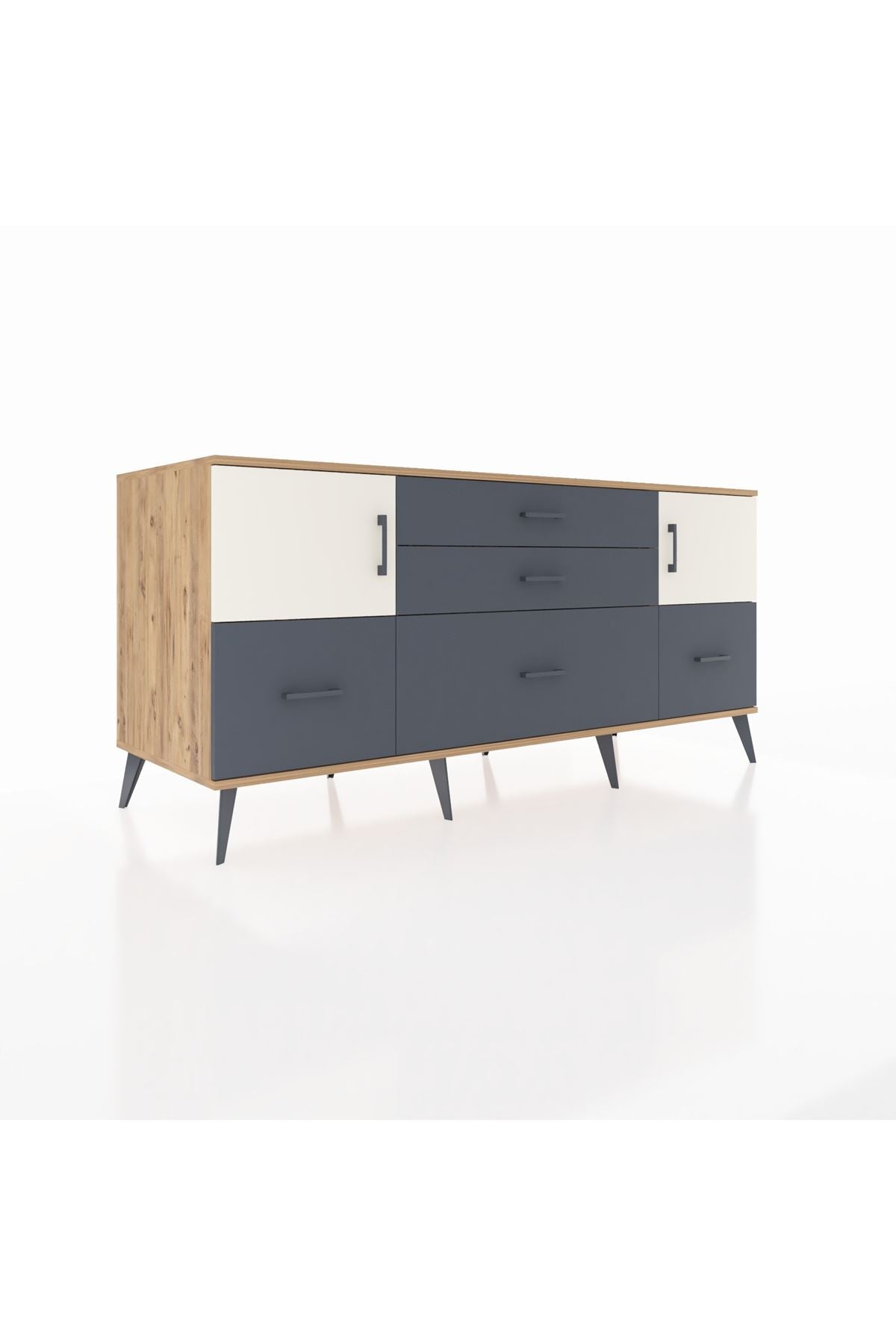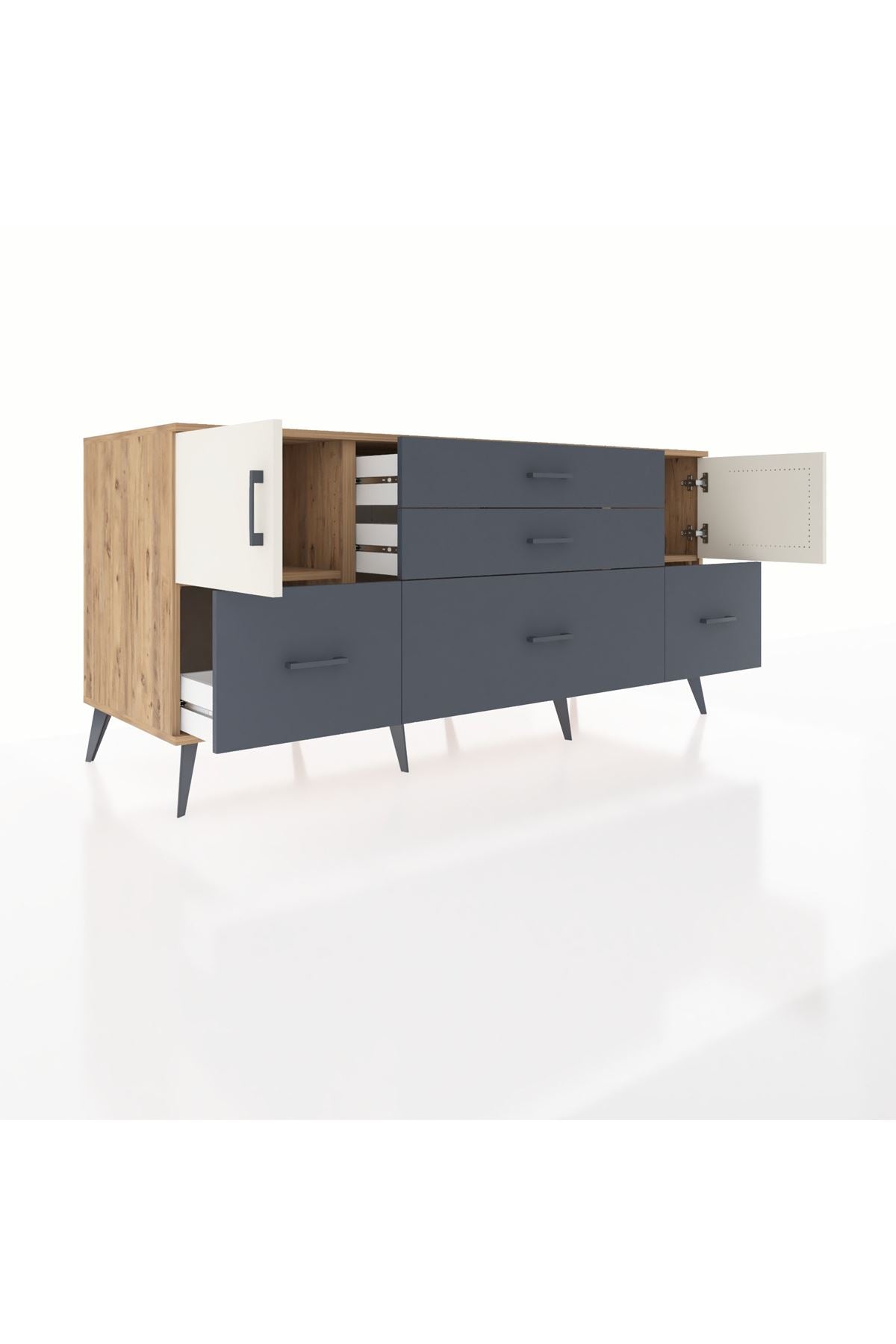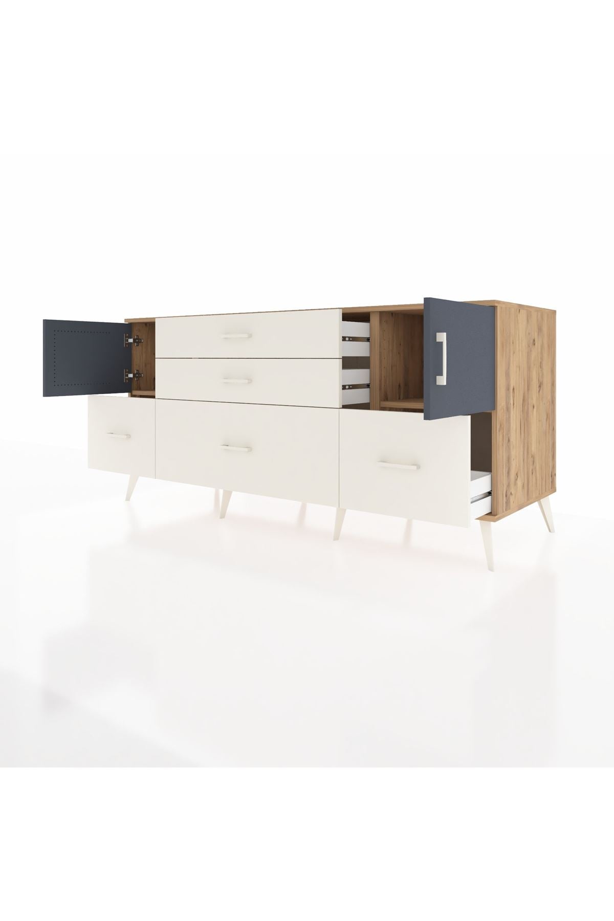 Kronos Konsol 2 Raflı 5 Çekmeceli 2 Kapaklı, yatak odası, oturma odası, çalışma odası, antre veya giyinme odası gibi birçok farklı alanda kullanılabilir. Şık tasarımı ve fonksiyonel yapısıyla evinize kolayca uyum sağlar.