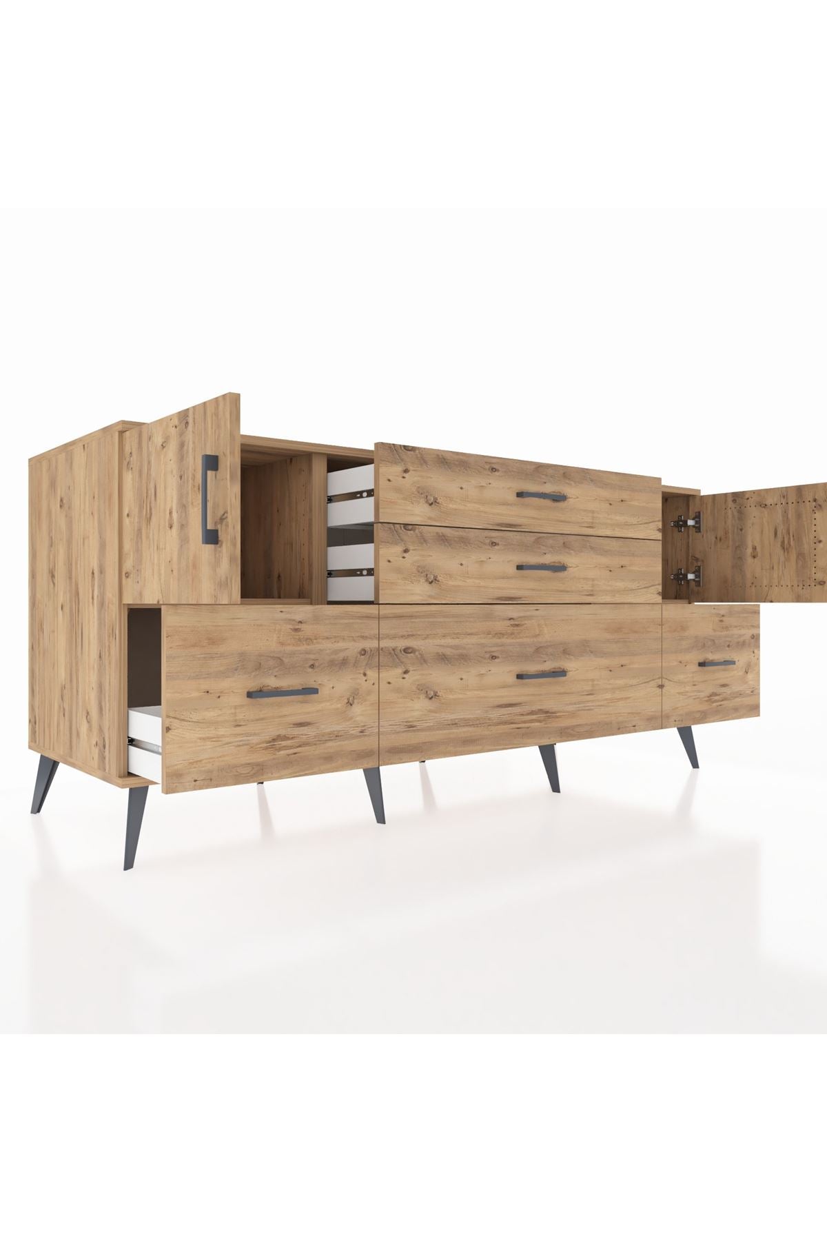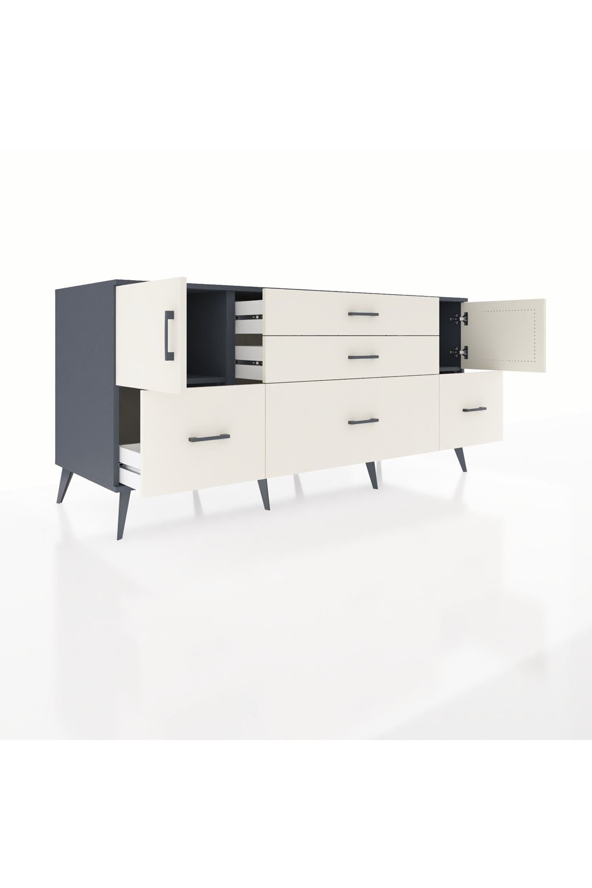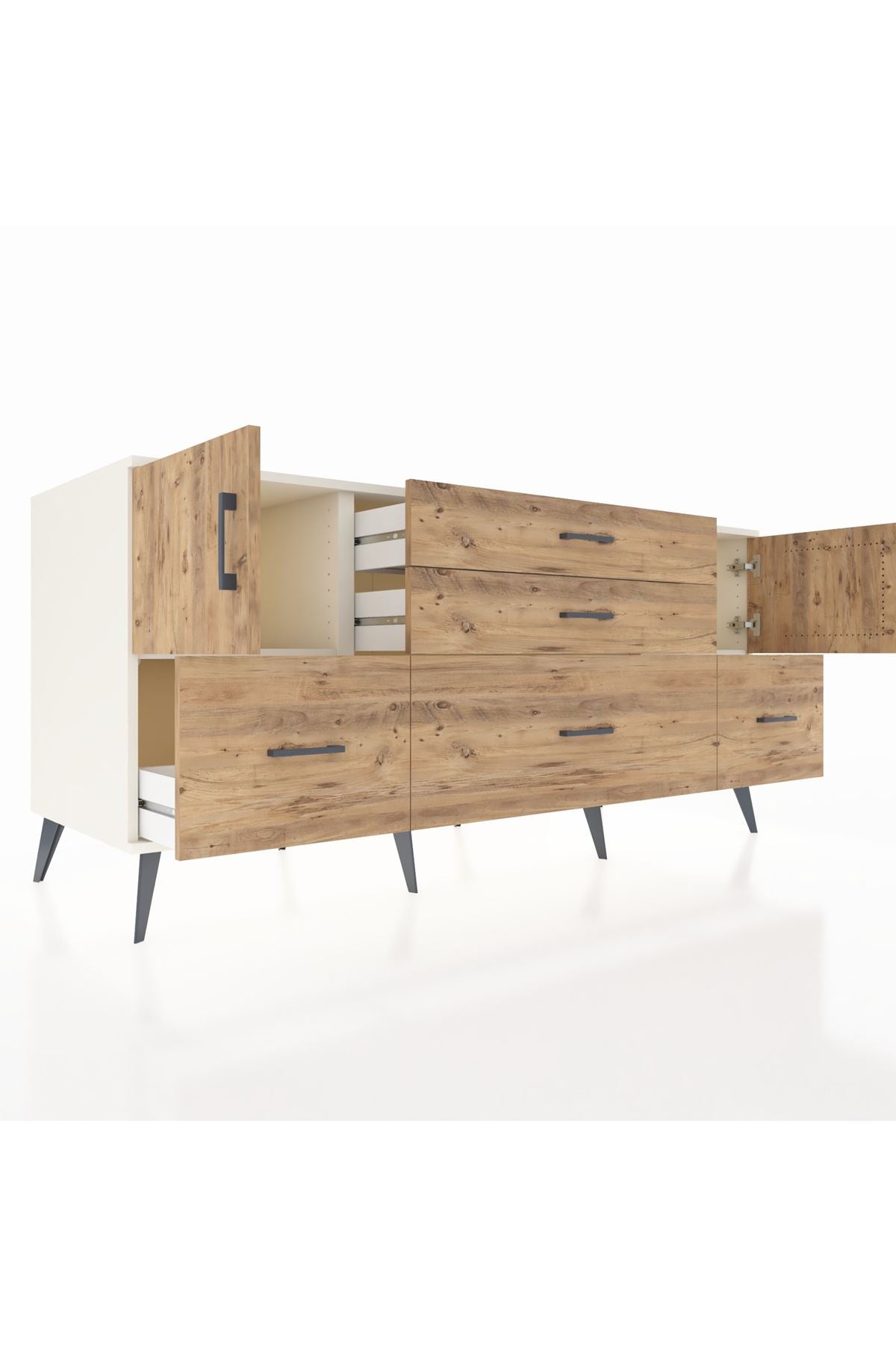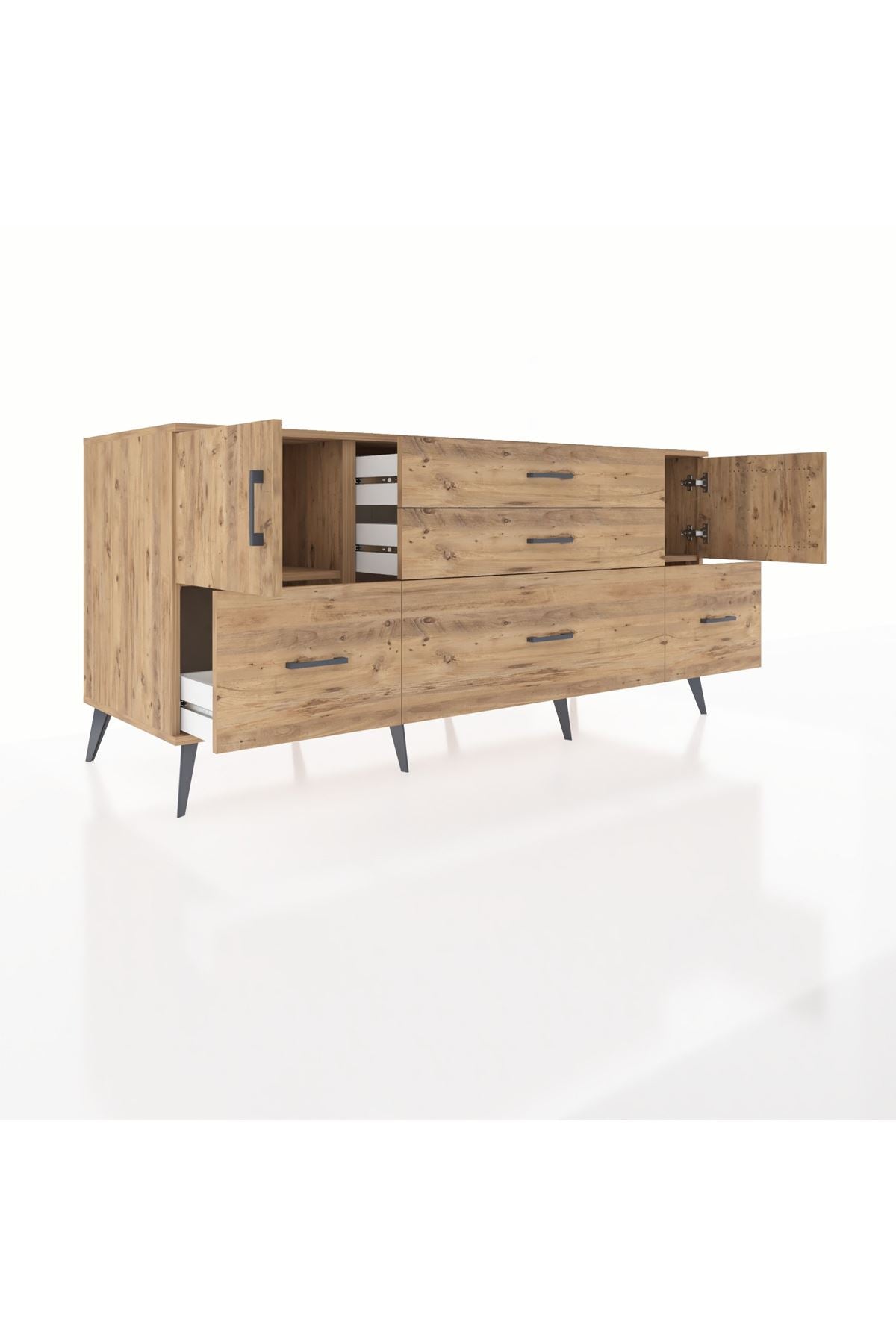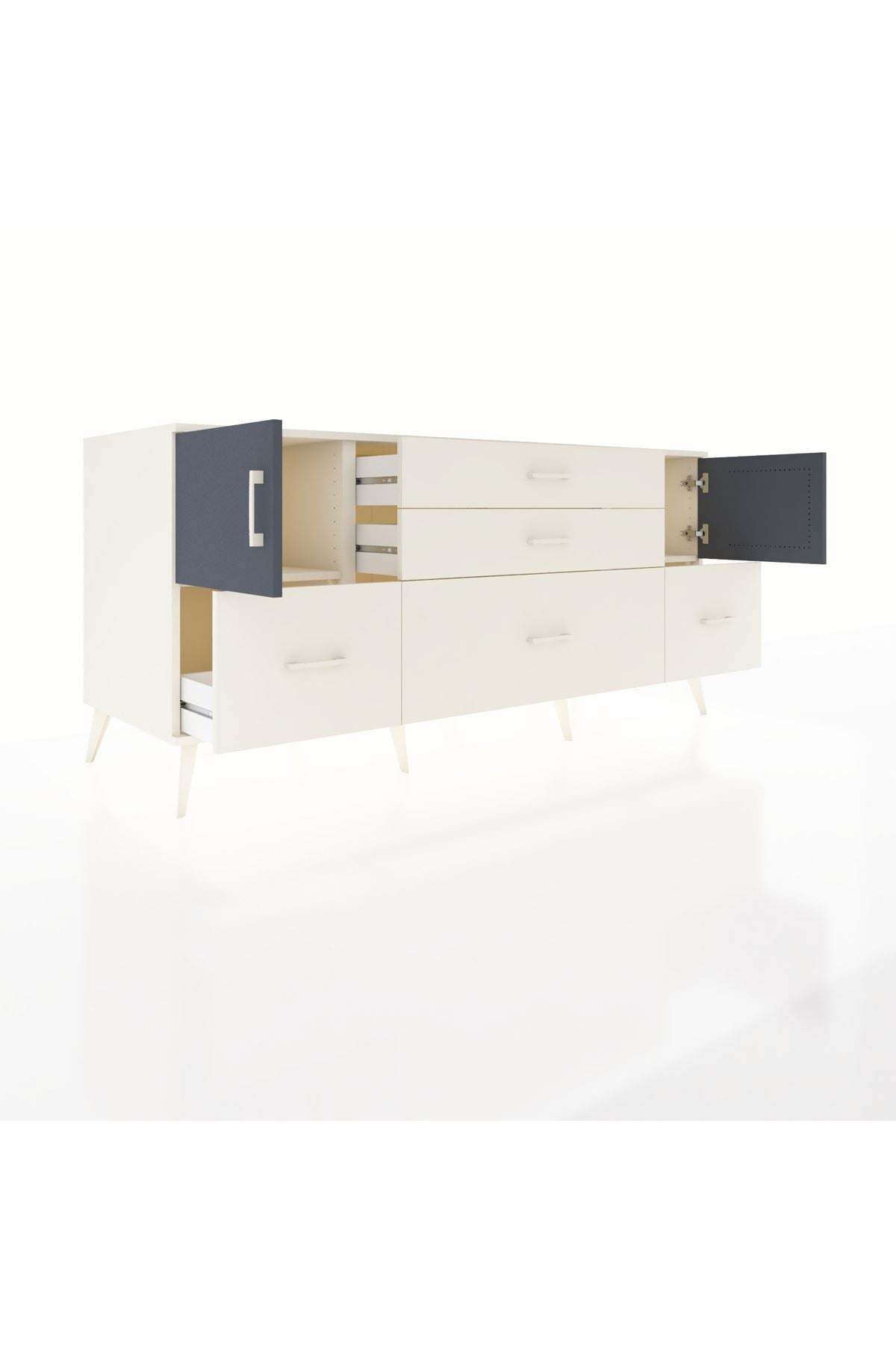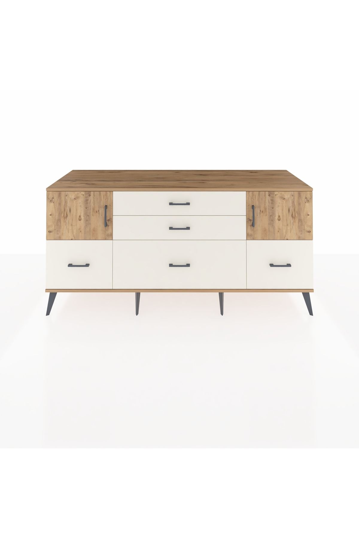 Kronos Konsol 2 Raflı 5 Çekmeceli 2 Kapaklı, yatak odası, oturma odası, çalışma odası, antre veya giyinme odası gibi birçok farklı alanda kullanılabilir. Şık tasarımı ve fonksiyonel yapısıyla evinize kolayca uyum sağlar.