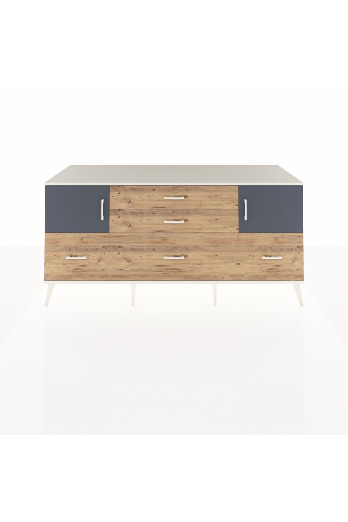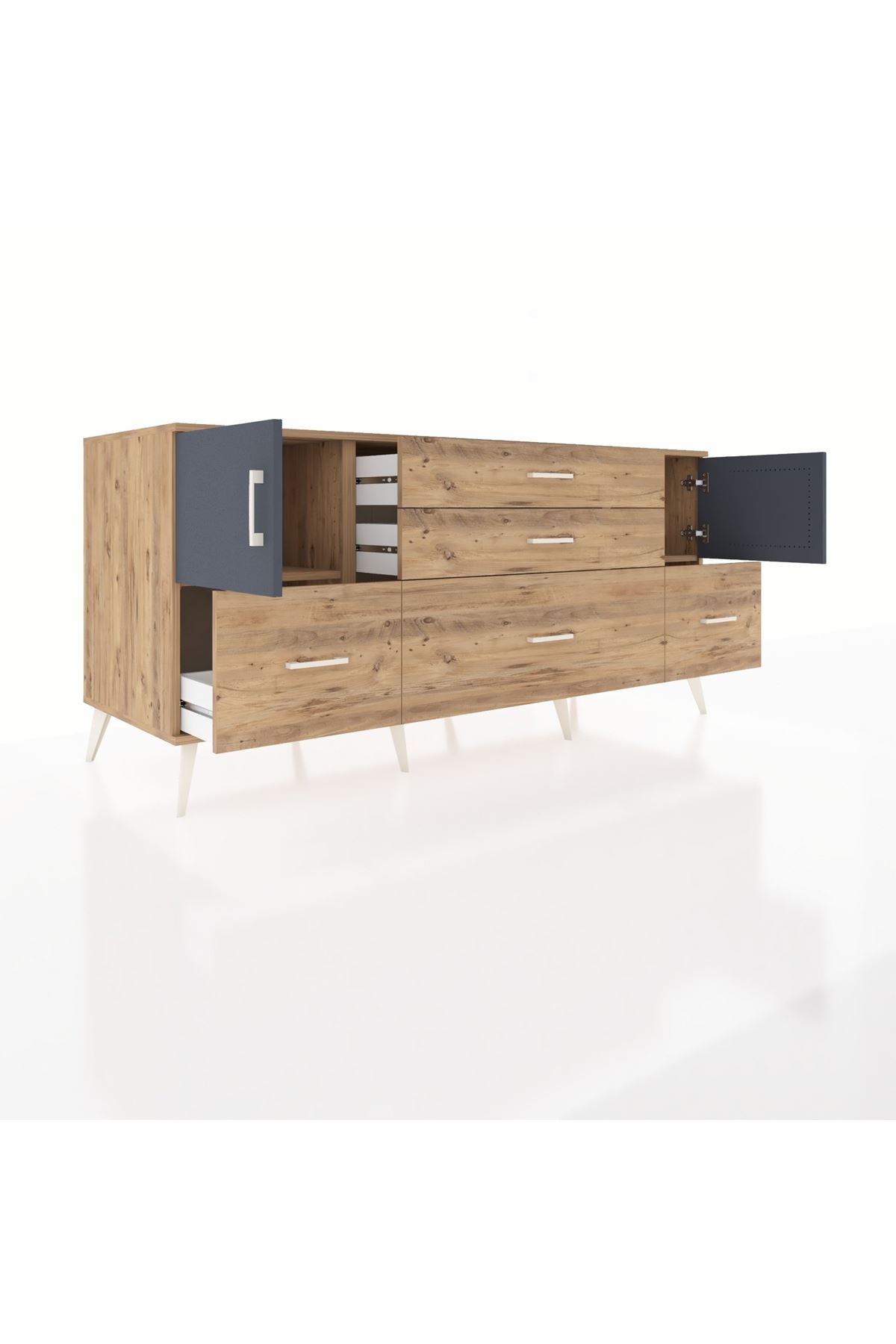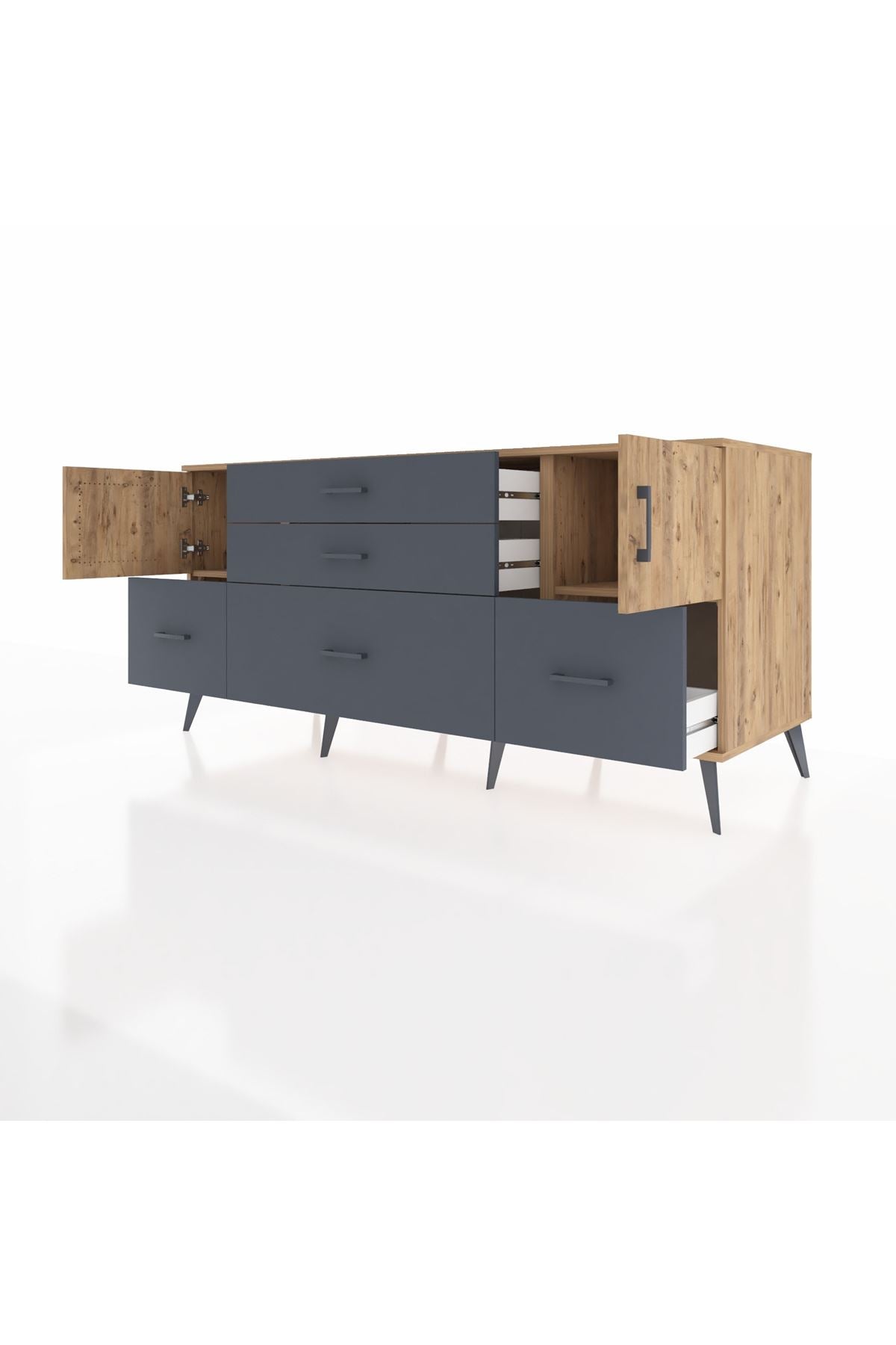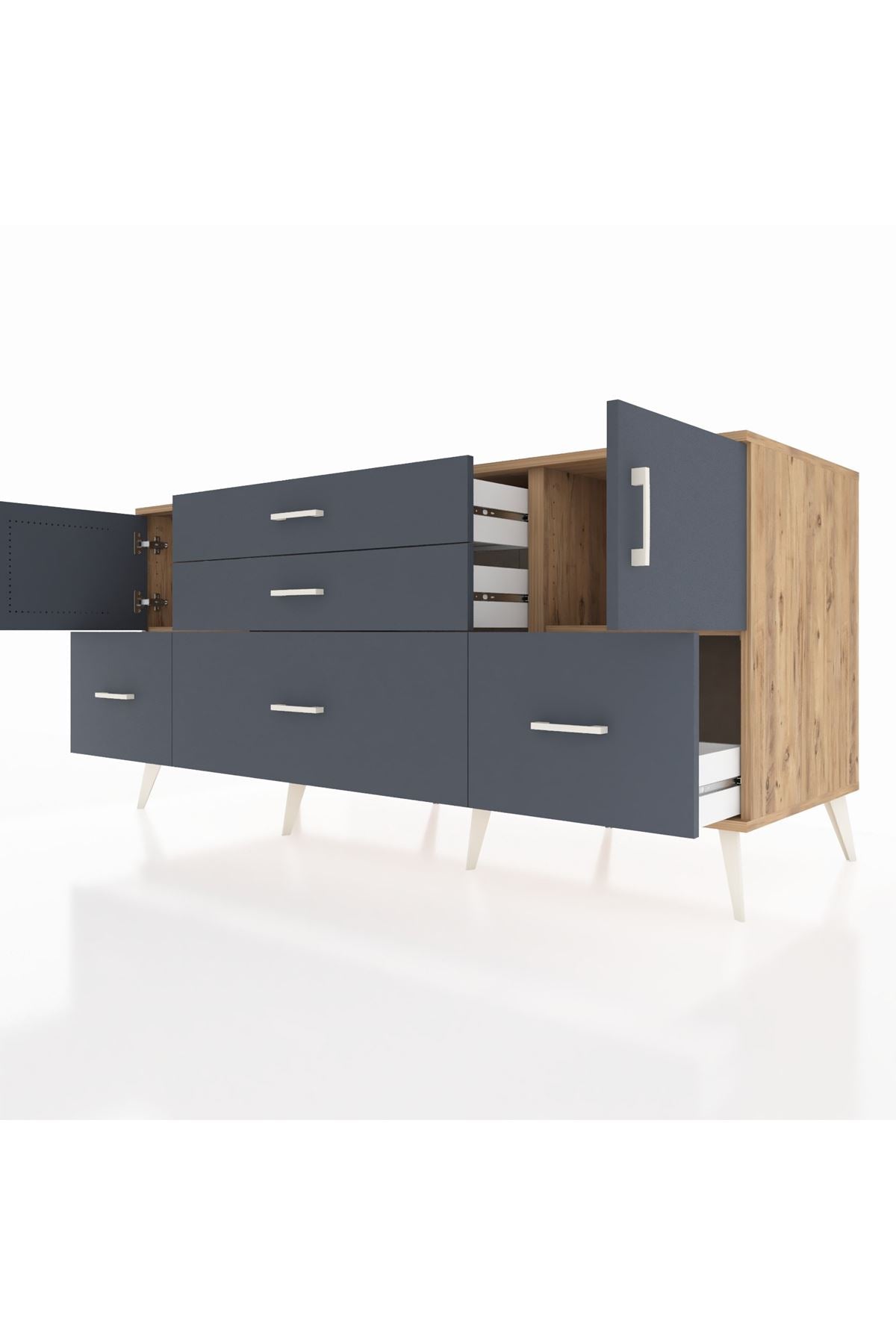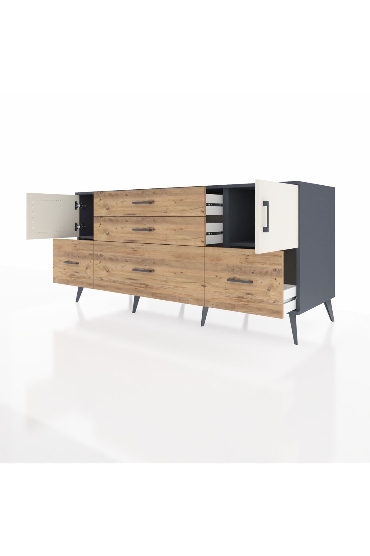 Kronos Konsol 2 Raflı 5 Çekmeceli 2 Kapaklı, yatak odası, oturma odası, çalışma odası, antre veya giyinme odası gibi birçok farklı alanda kullanılabilir. Şık tasarımı ve fonksiyonel yapısıyla evinize kolayca uyum sağlar.