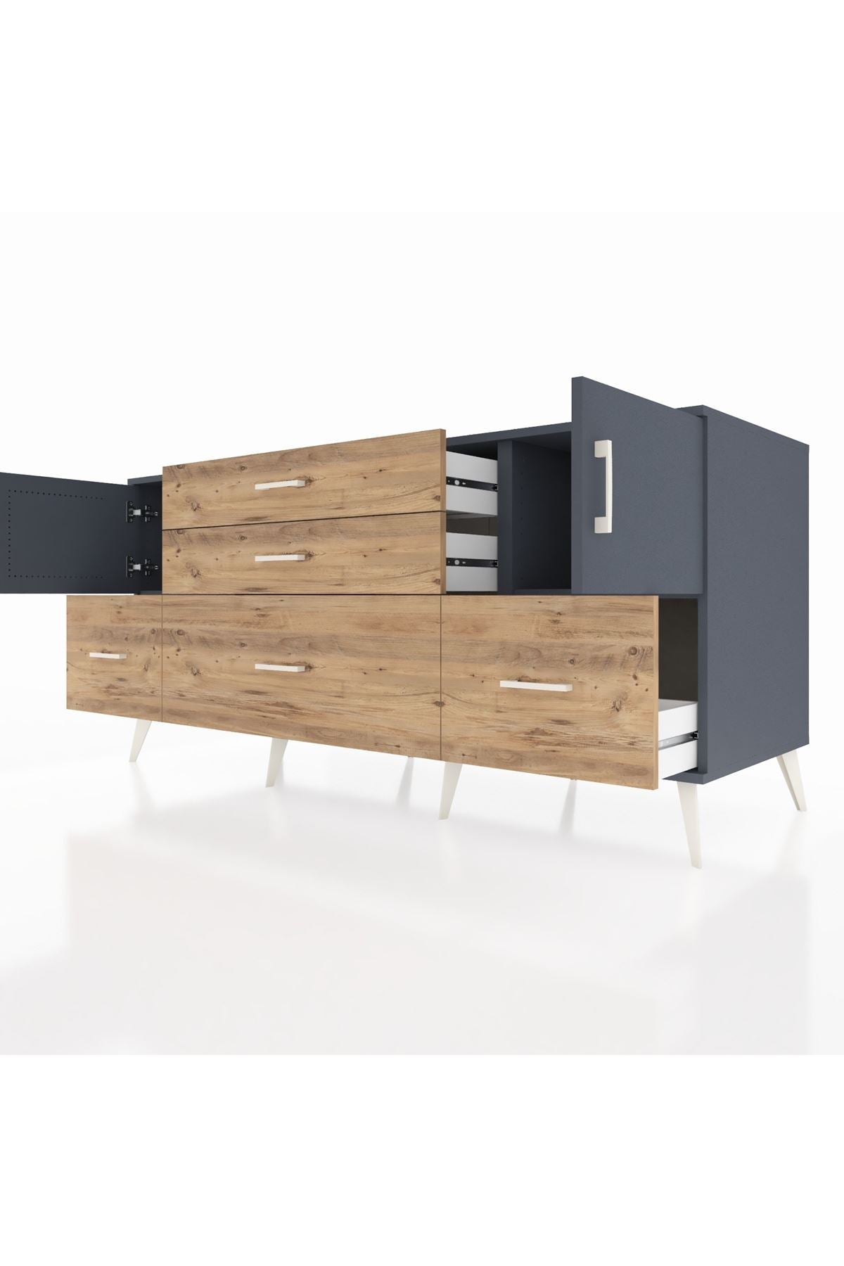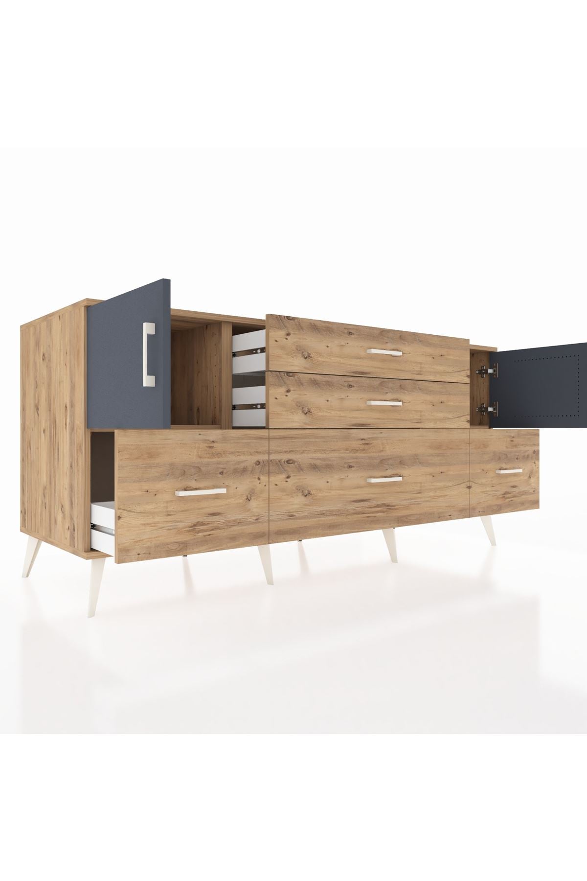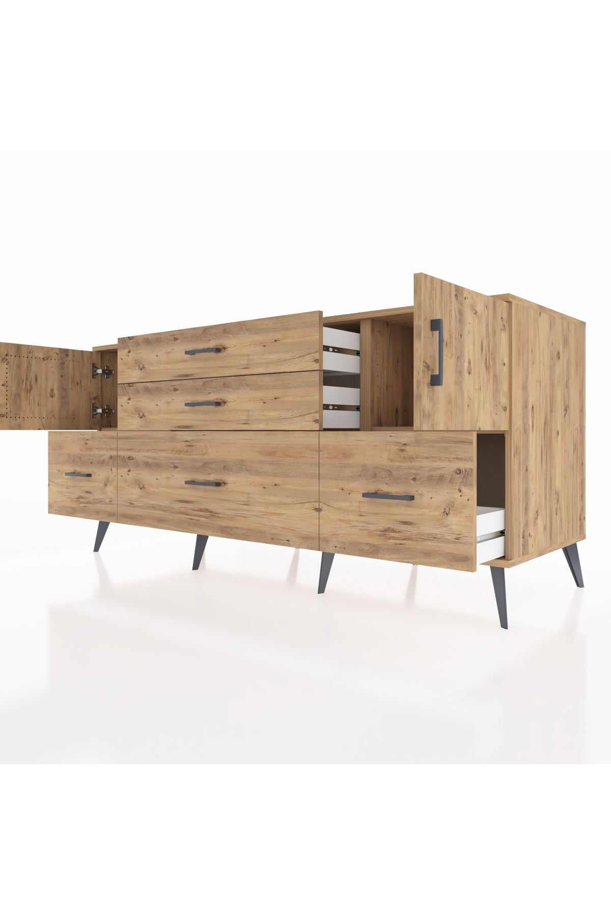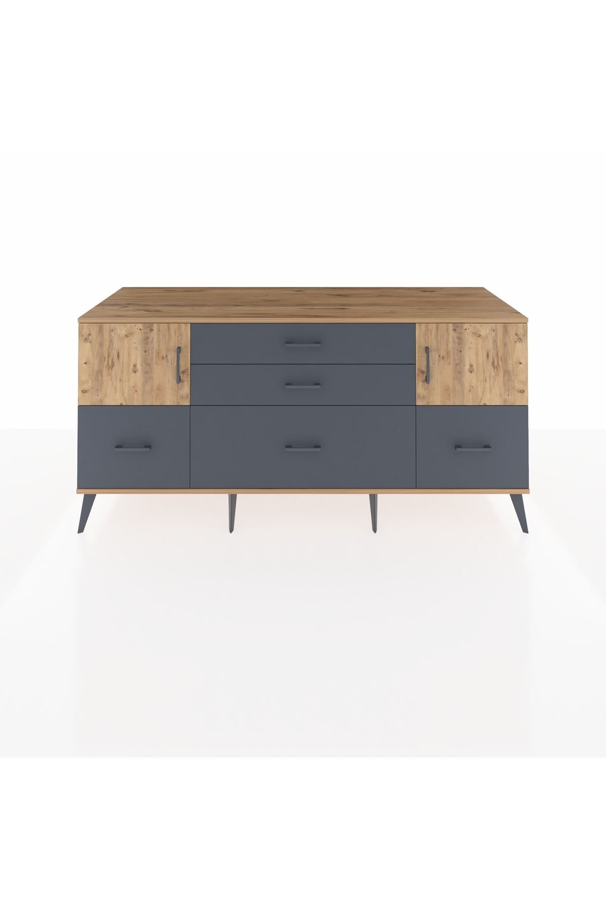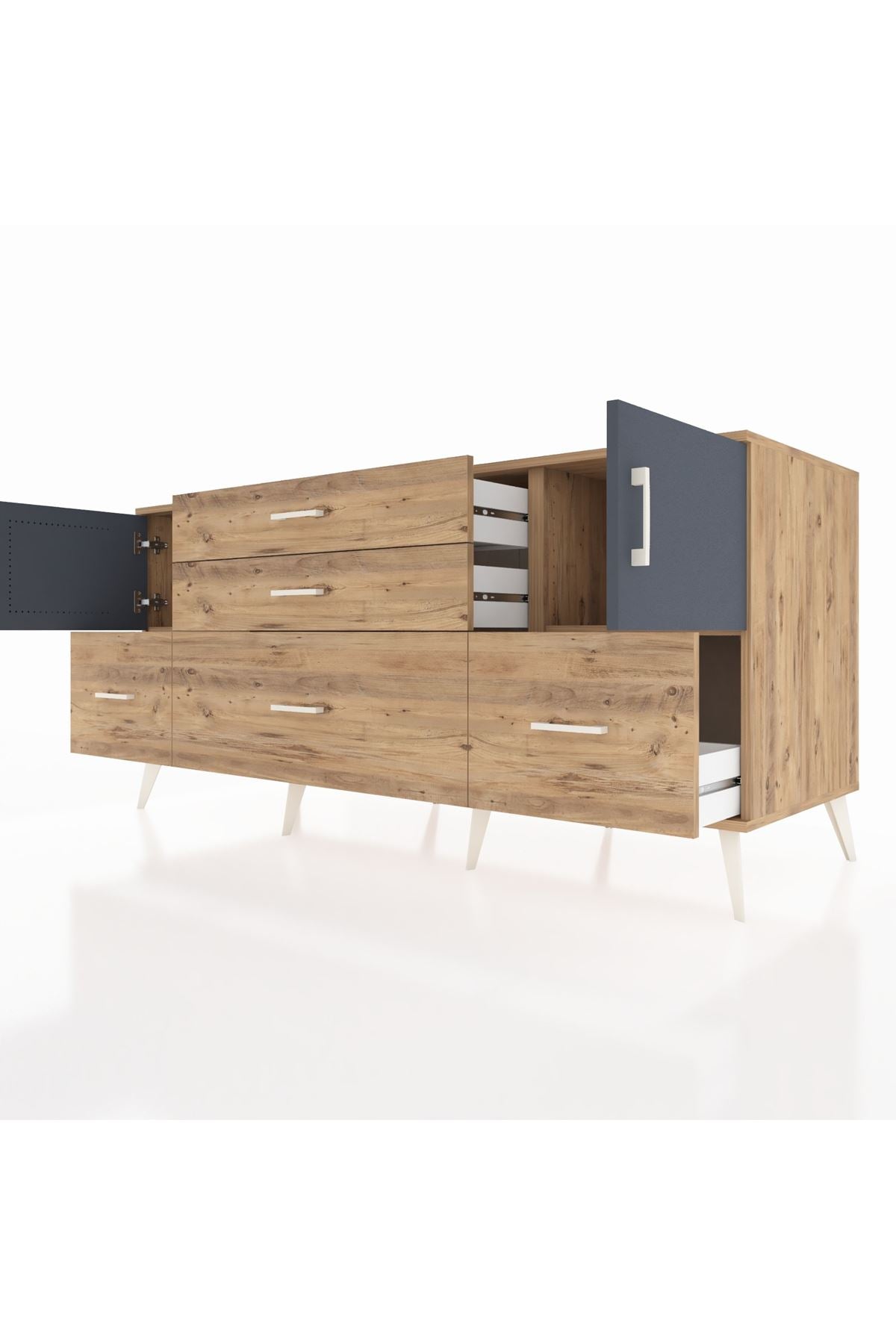 Kronos Konsol 2 Raflı 5 Çekmeceli 2 Kapaklı, yatak odası, oturma odası, çalışma odası, antre veya giyinme odası gibi birçok farklı alanda kullanılabilir. Şık tasarımı ve fonksiyonel yapısıyla evinize kolayca uyum sağlar.