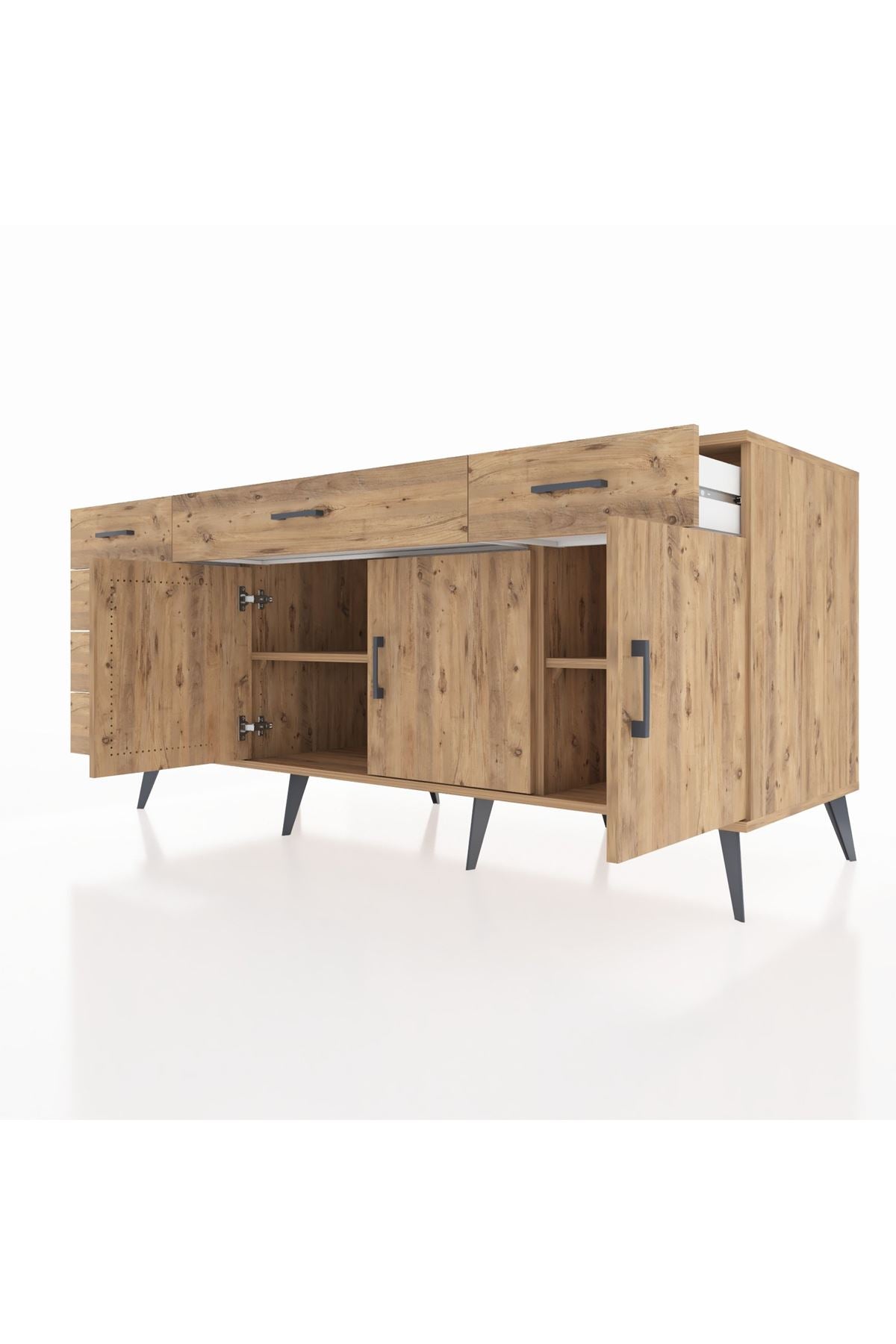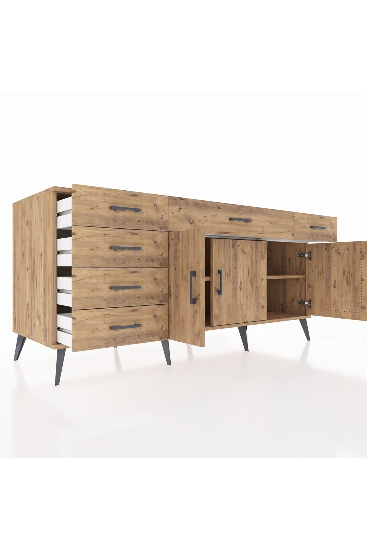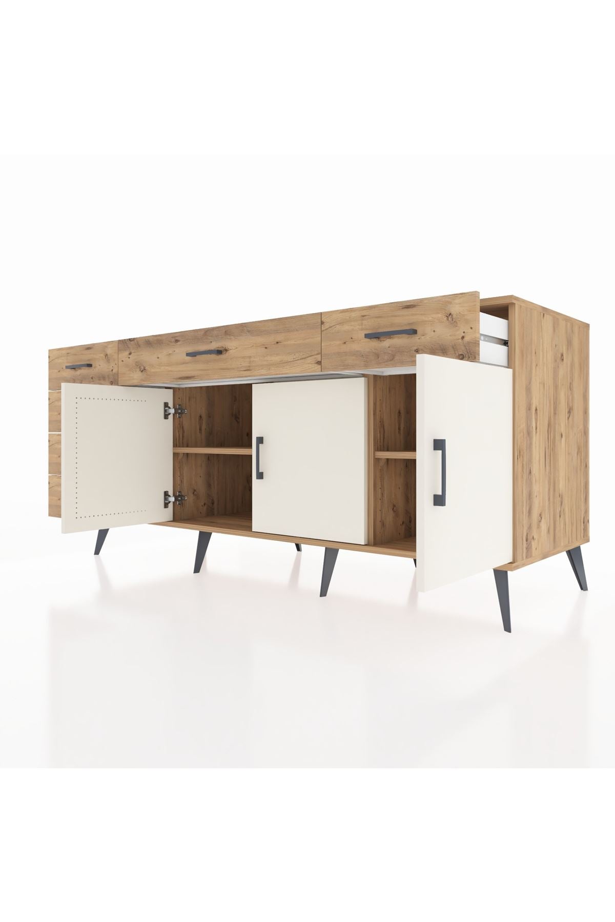 🦾 Konsolun modern görünümünü tamamlayan metal ayaklar, hem şıklık katıyor hem de sağlam bir zemin oluşturuyor. Metal kulplar ise, çekmecelerin ve kapakların kolayca açılmasını sağlarken, tasarıma zarif bir dokunuş ekliyor.