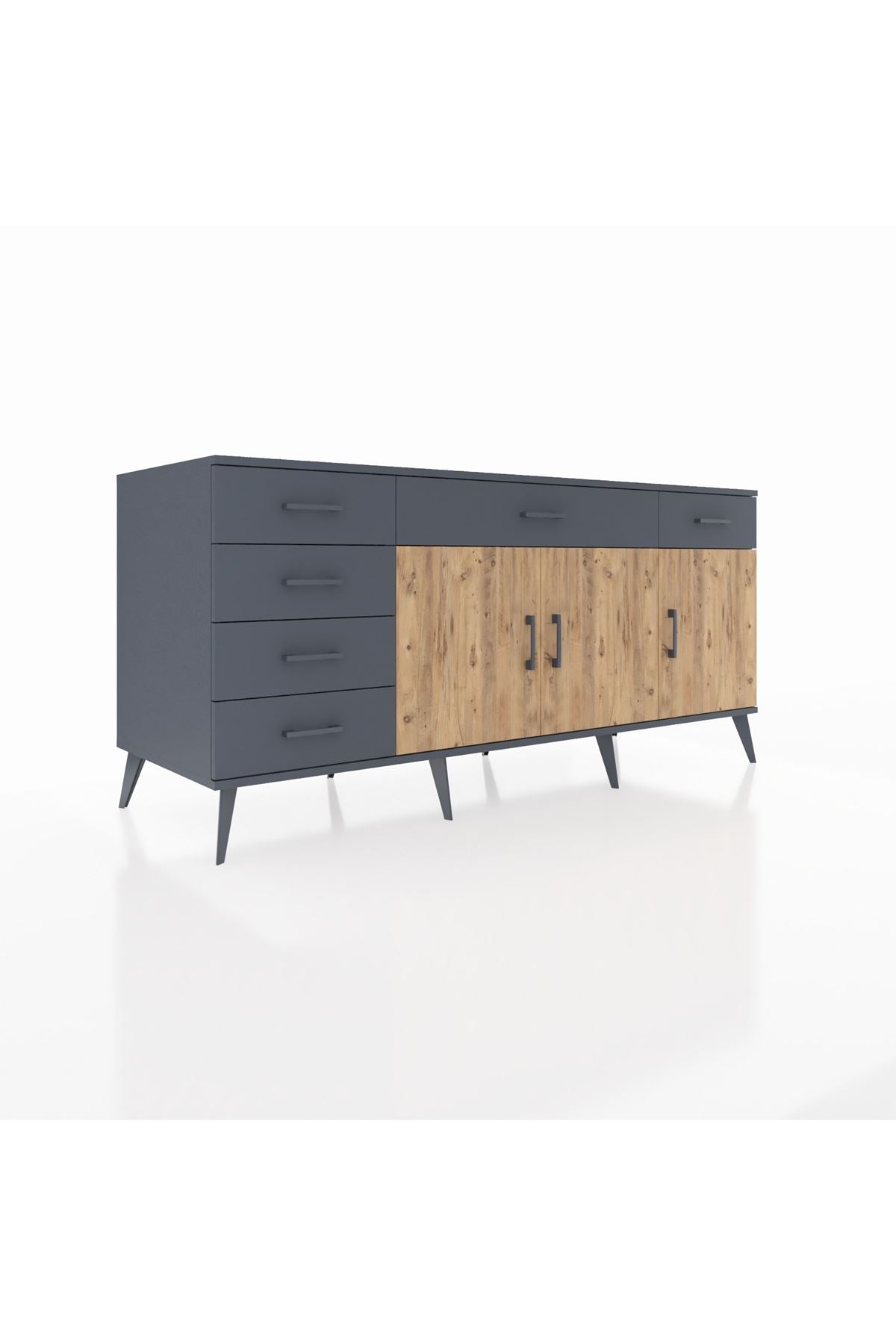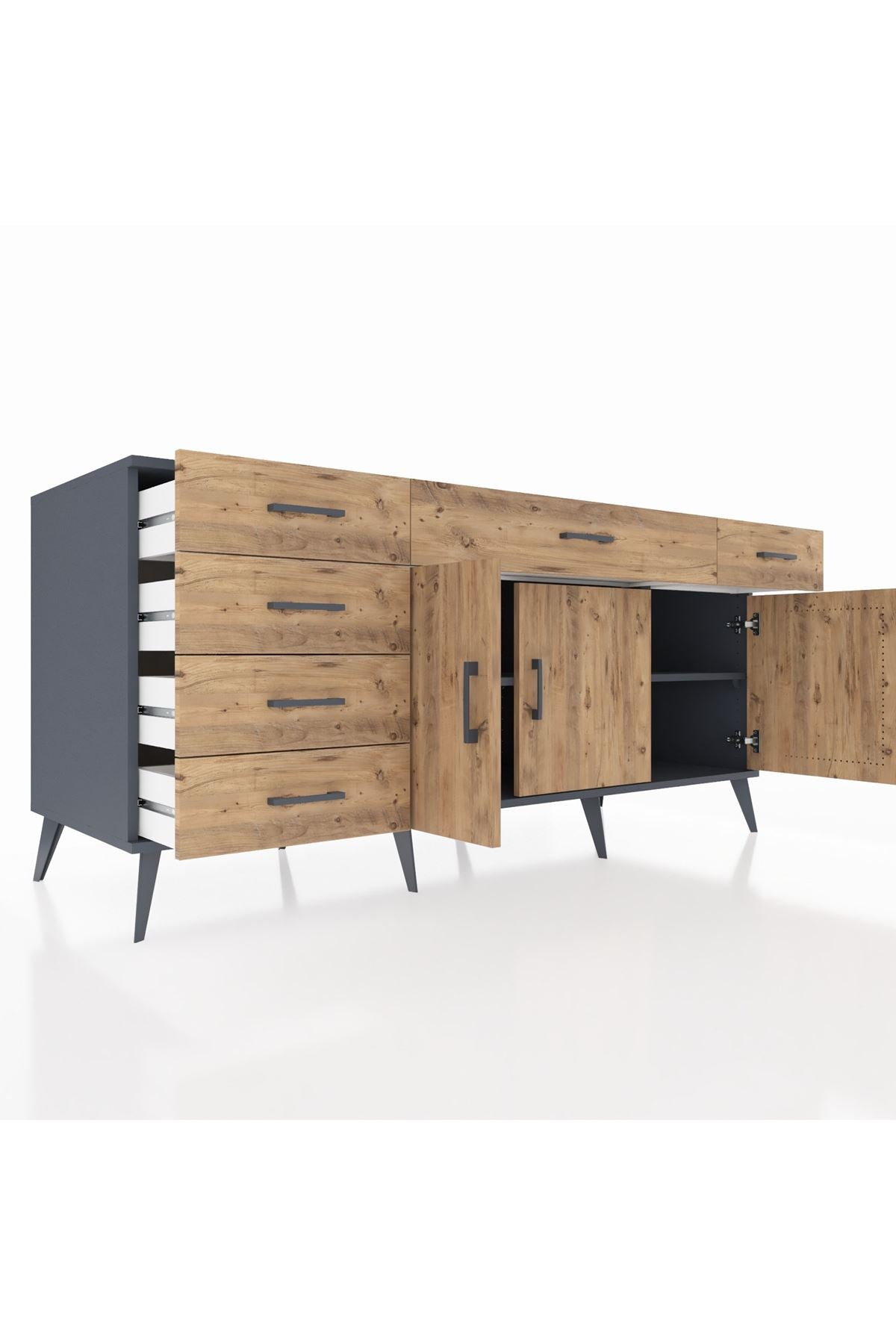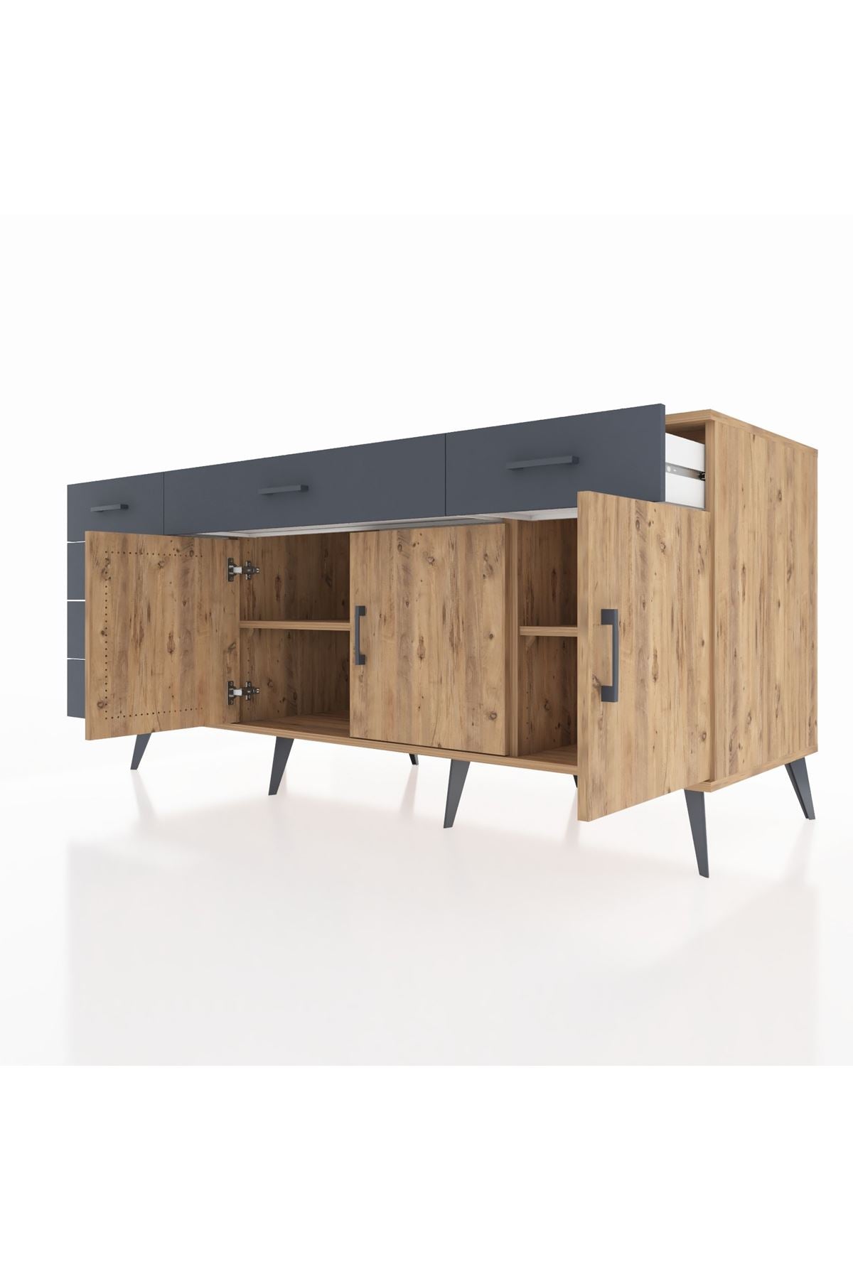 🦾 Konsolun modern görünümünü tamamlayan metal ayaklar, hem şıklık katıyor hem de sağlam bir zemin oluşturuyor. Metal kulplar ise, çekmecelerin ve kapakların kolayca açılmasını sağlarken, tasarıma zarif bir dokunuş ekliyor.
