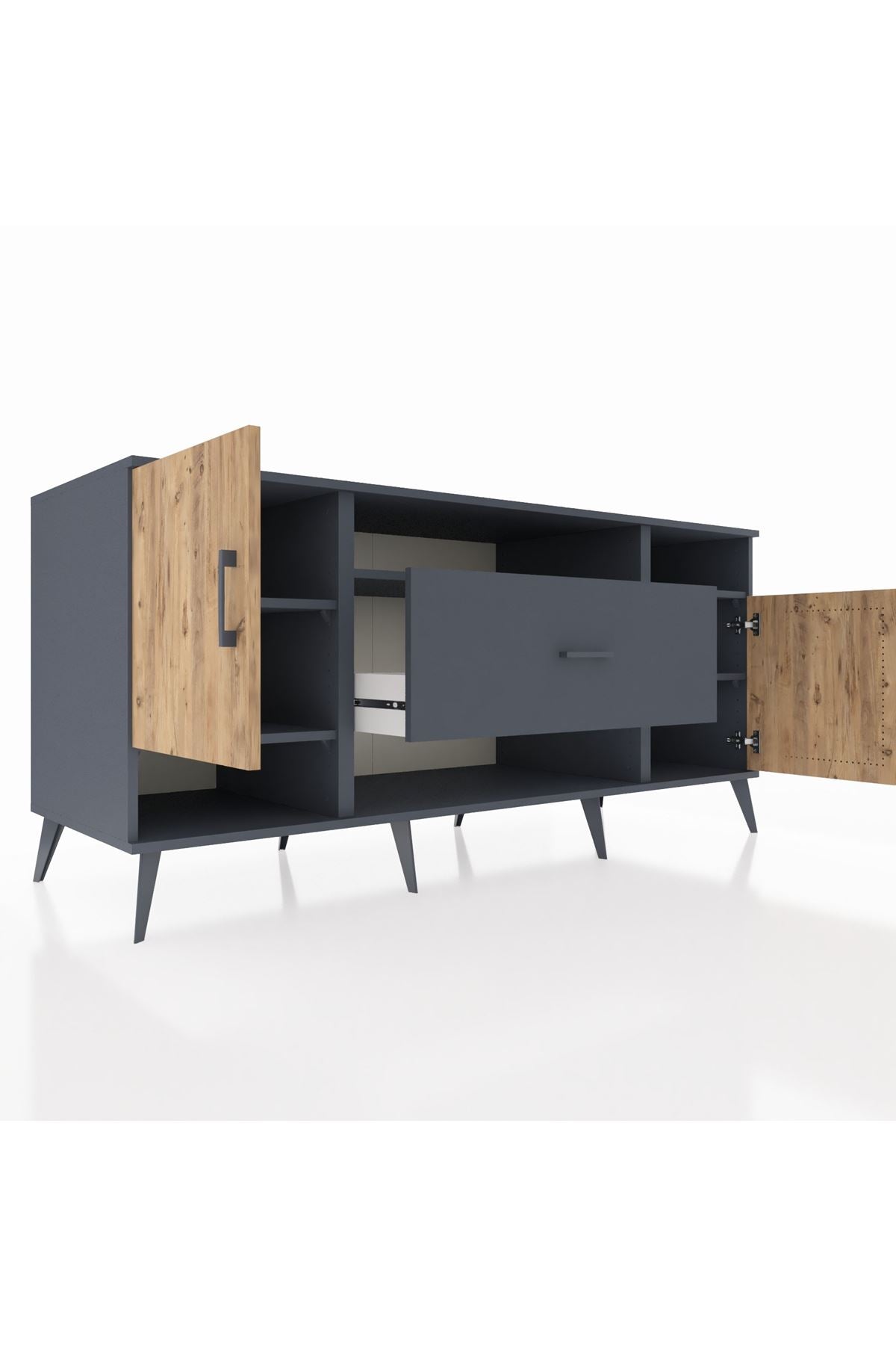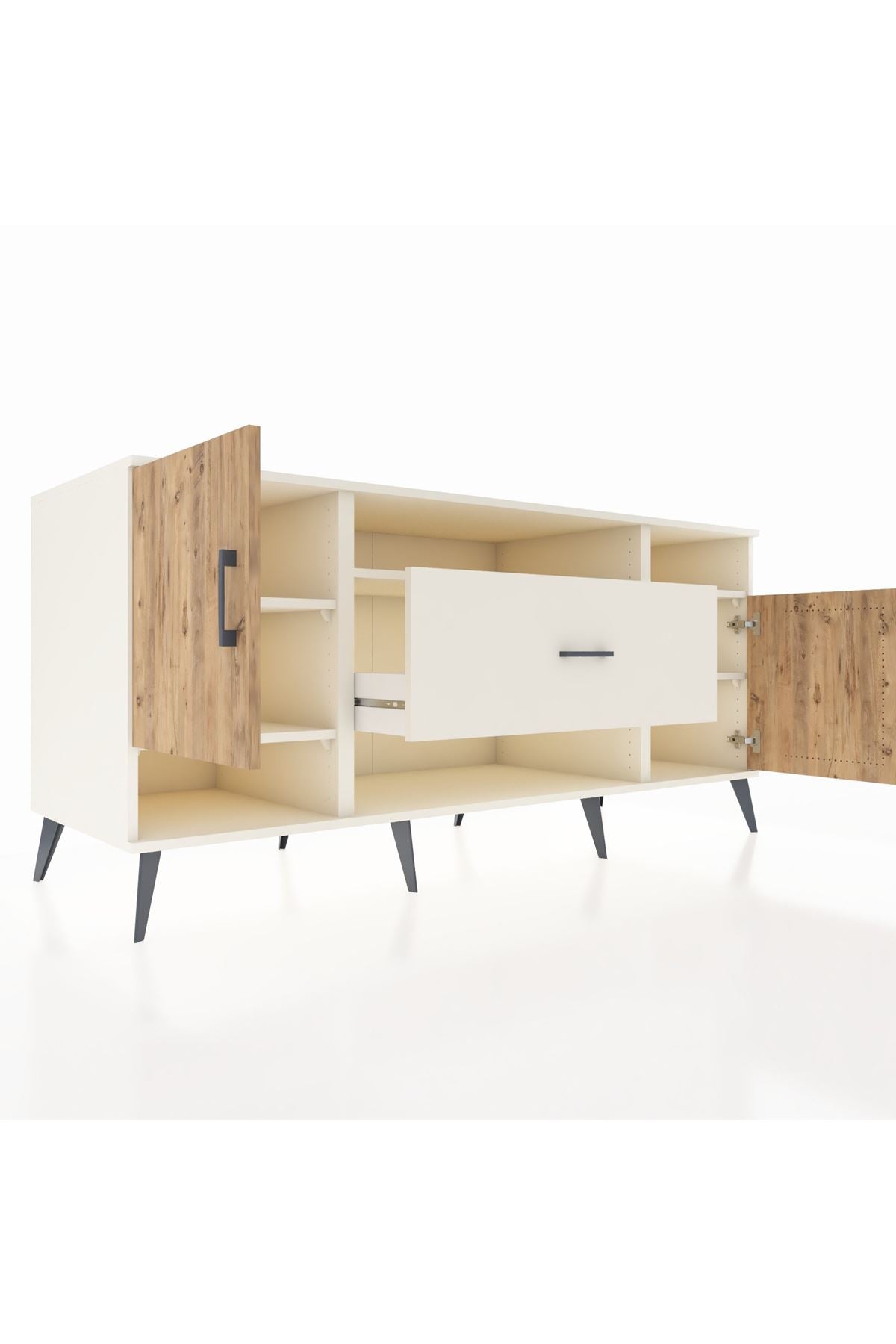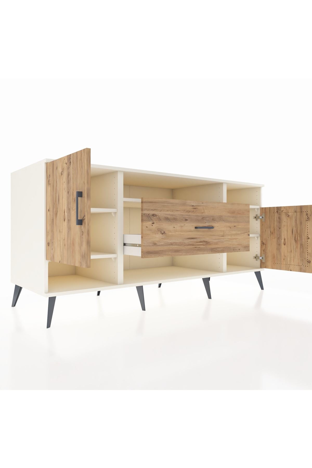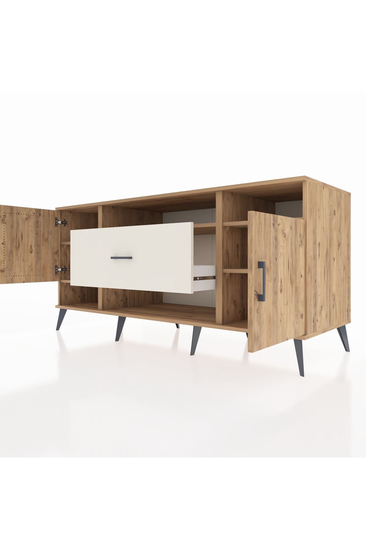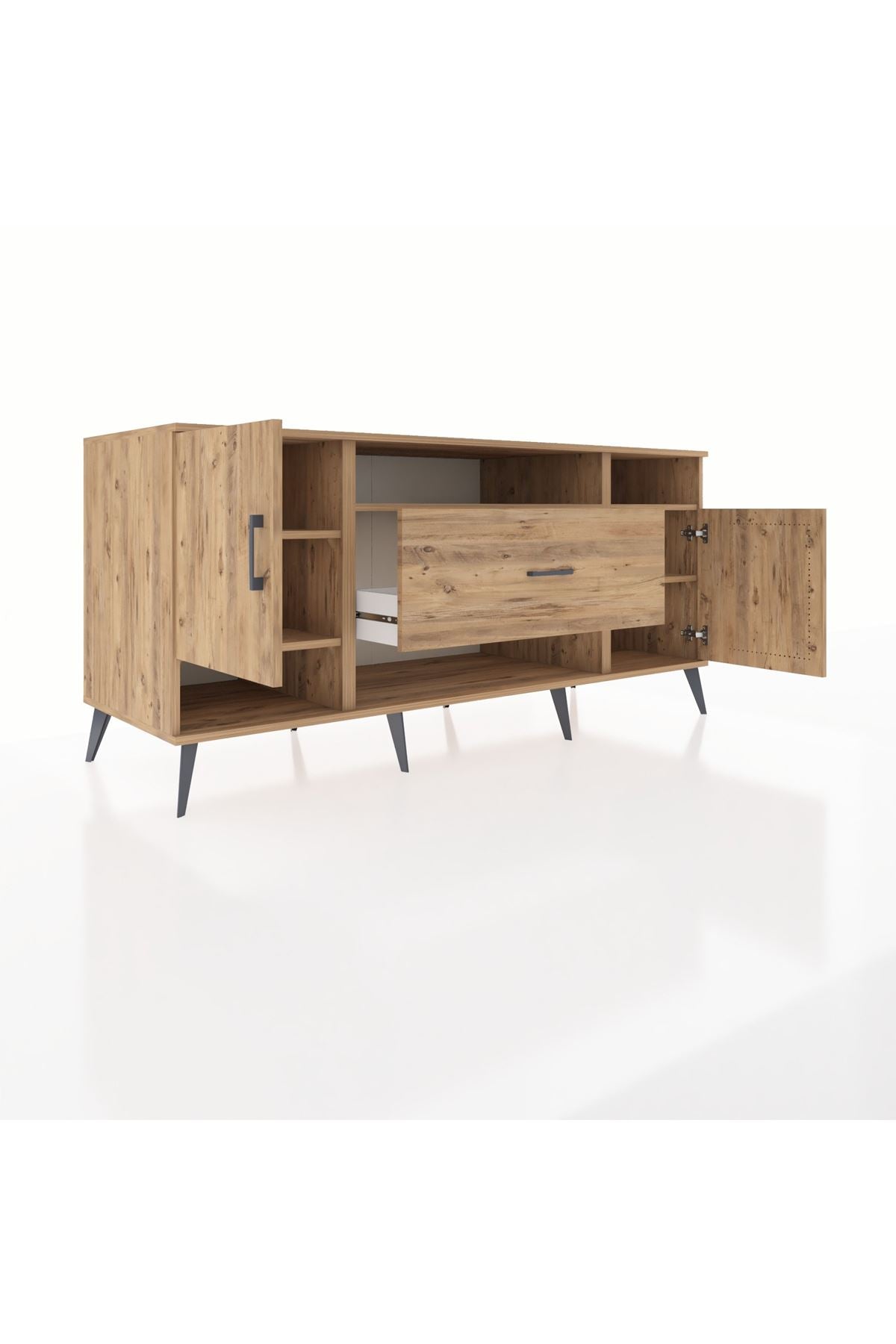 🦾 Metal ayaklar ve metal kulplar, konsolun modern ve şık görünümünü pekiştiriyor. Metal detaylar, hem sağlamlık sunar hem de tasarıma zarif bir dokunuş katar.