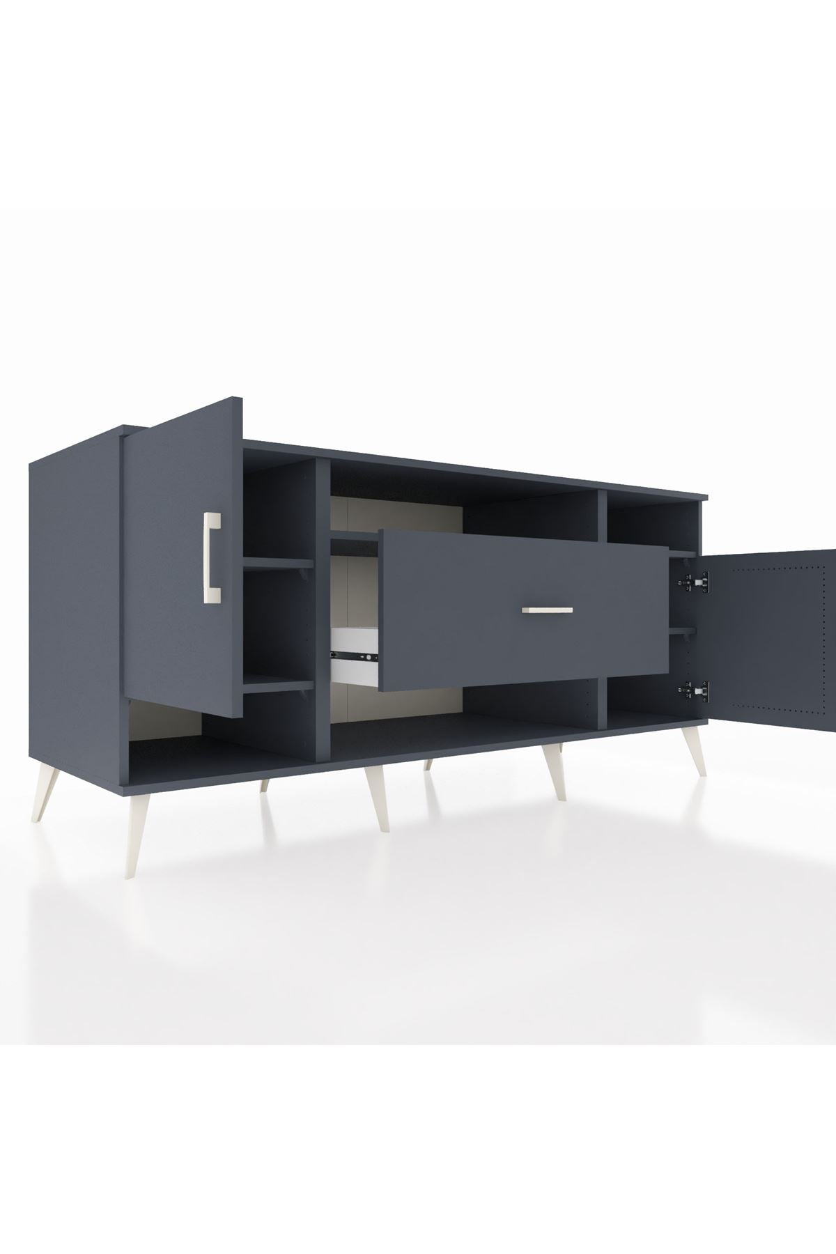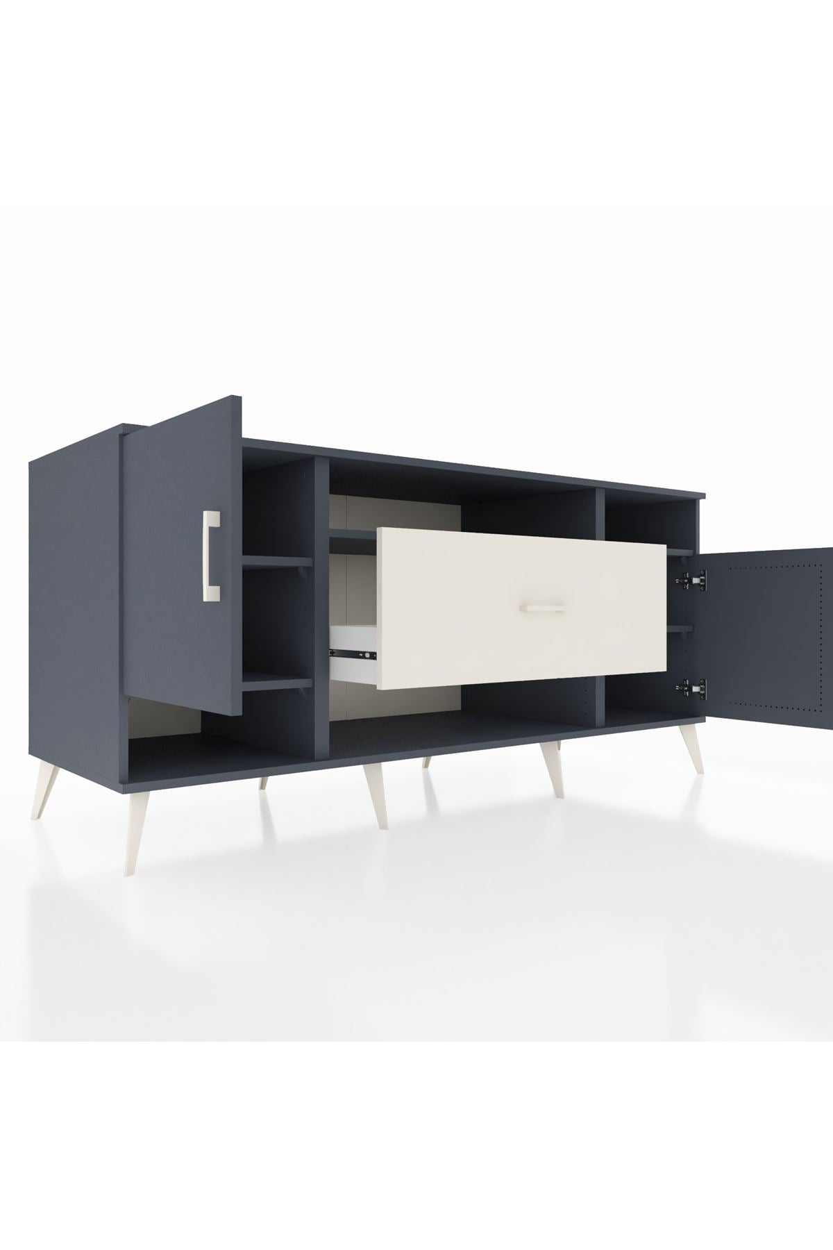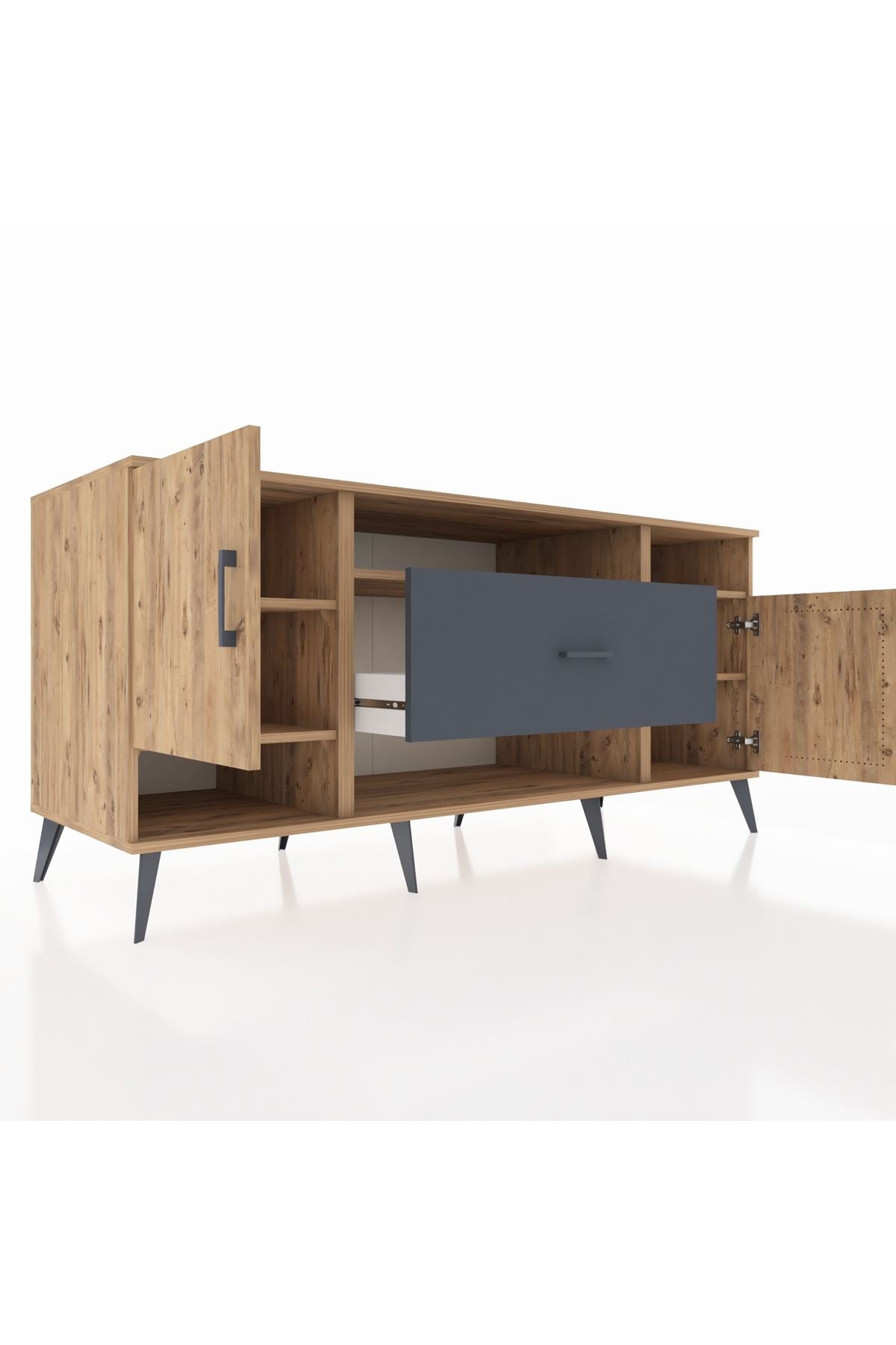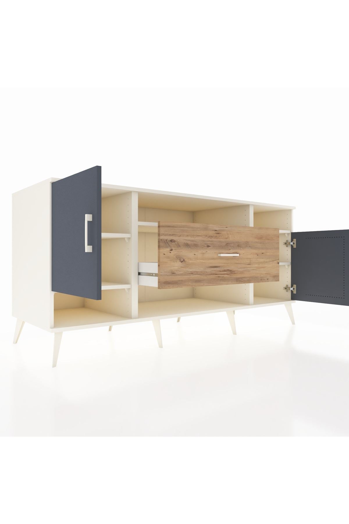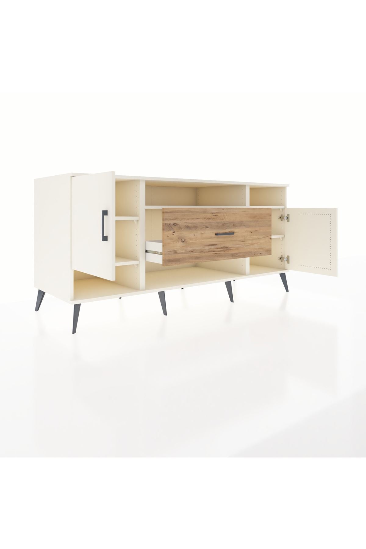 🦾 Metal ayaklar ve metal kulplar, konsolun modern ve şık görünümünü pekiştiriyor. Metal detaylar, hem sağlamlık sunar hem de tasarıma zarif bir dokunuş katar.