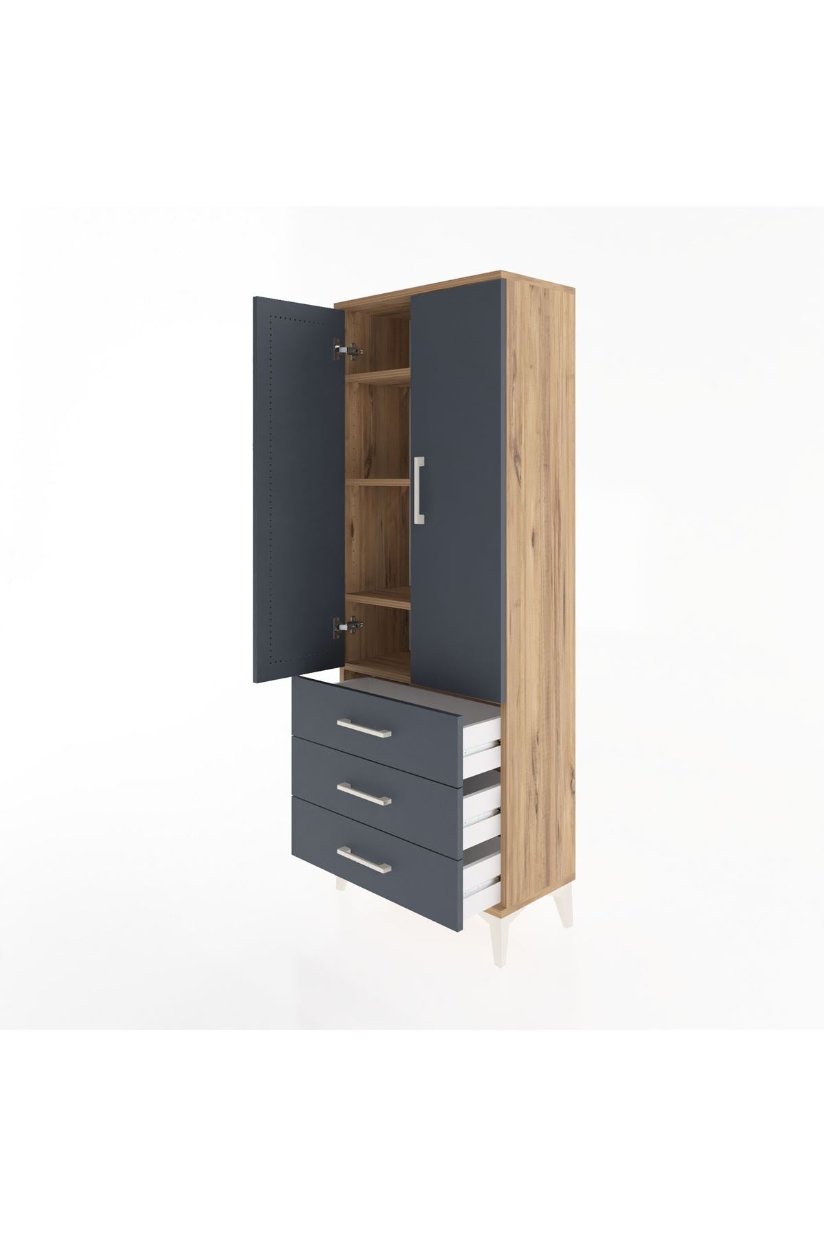 Arges Dolap 4 Raflı 3 Çekmeceli 2 Kapaklı 60x30x163 Çam-Antrasit