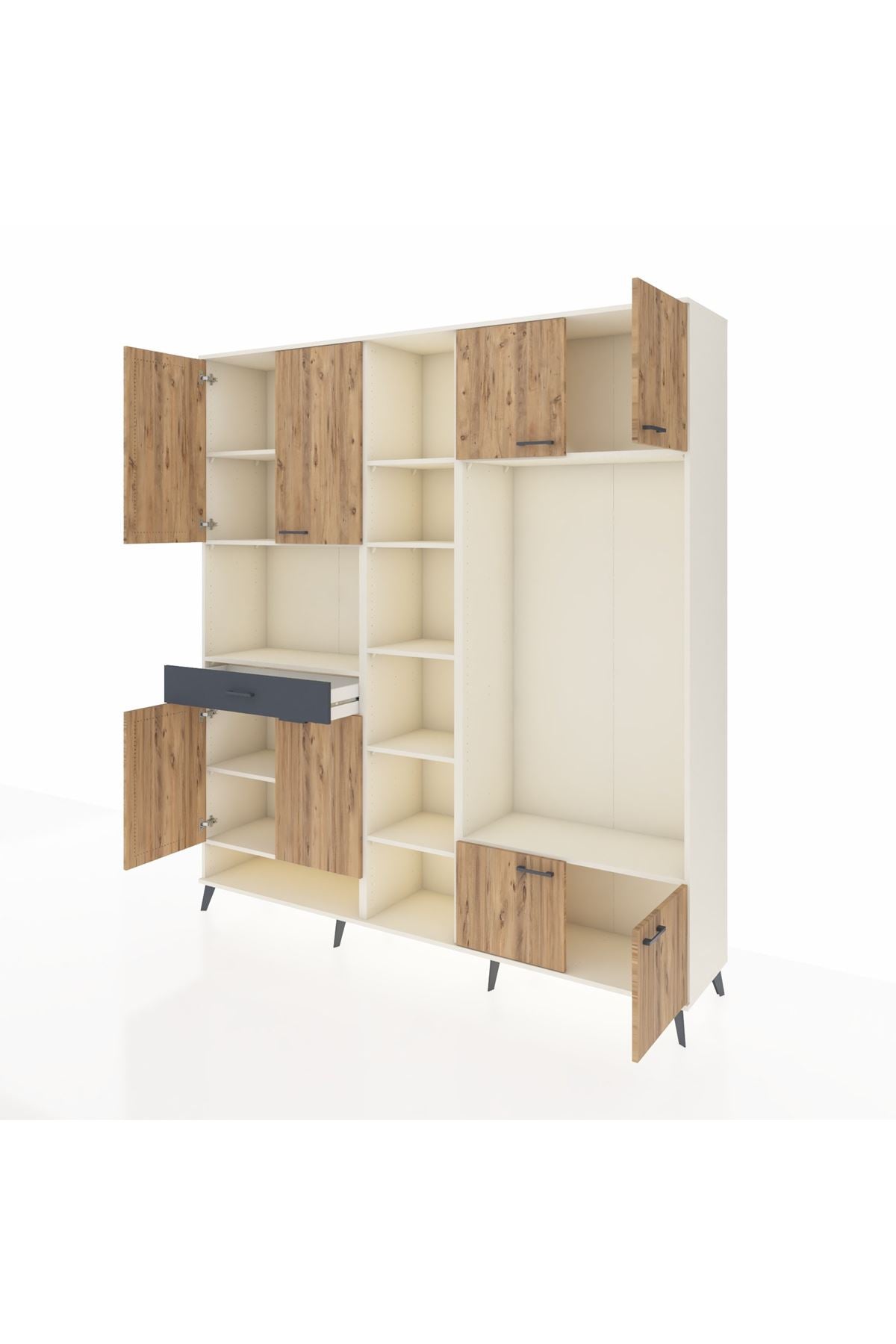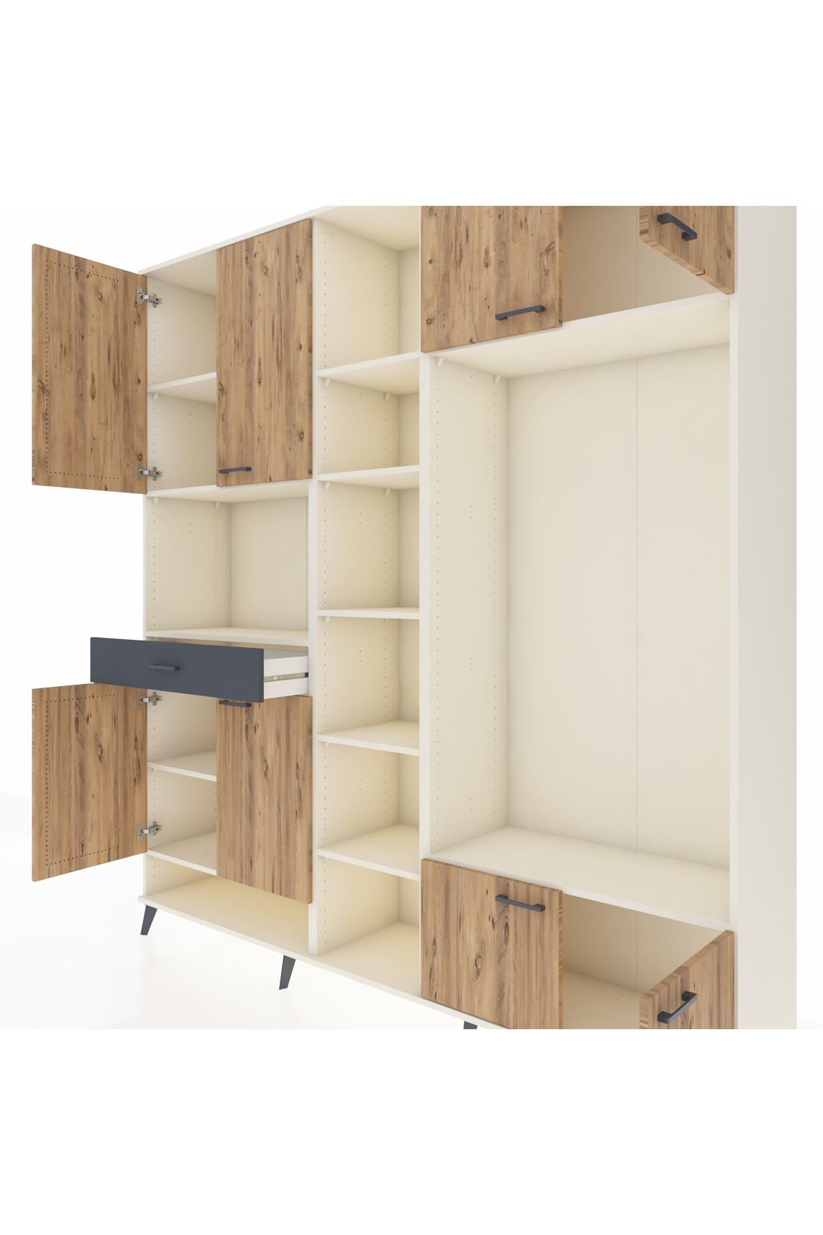 💫 Hyperion Dolap 12 Raflı, Tek Çekmeceli ve 8 Kapaklı tasarımı ile çam ve antrasitin doğal uyumunu evinize getiriyor. Modern ve işlevsel yapısı ile evinizin farklı köşelerinde estetik bir fark yaratın.