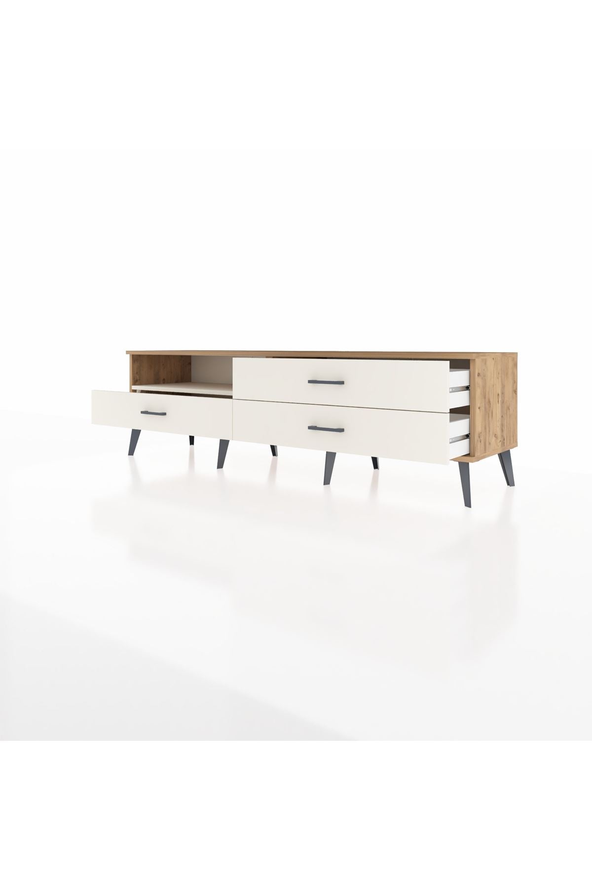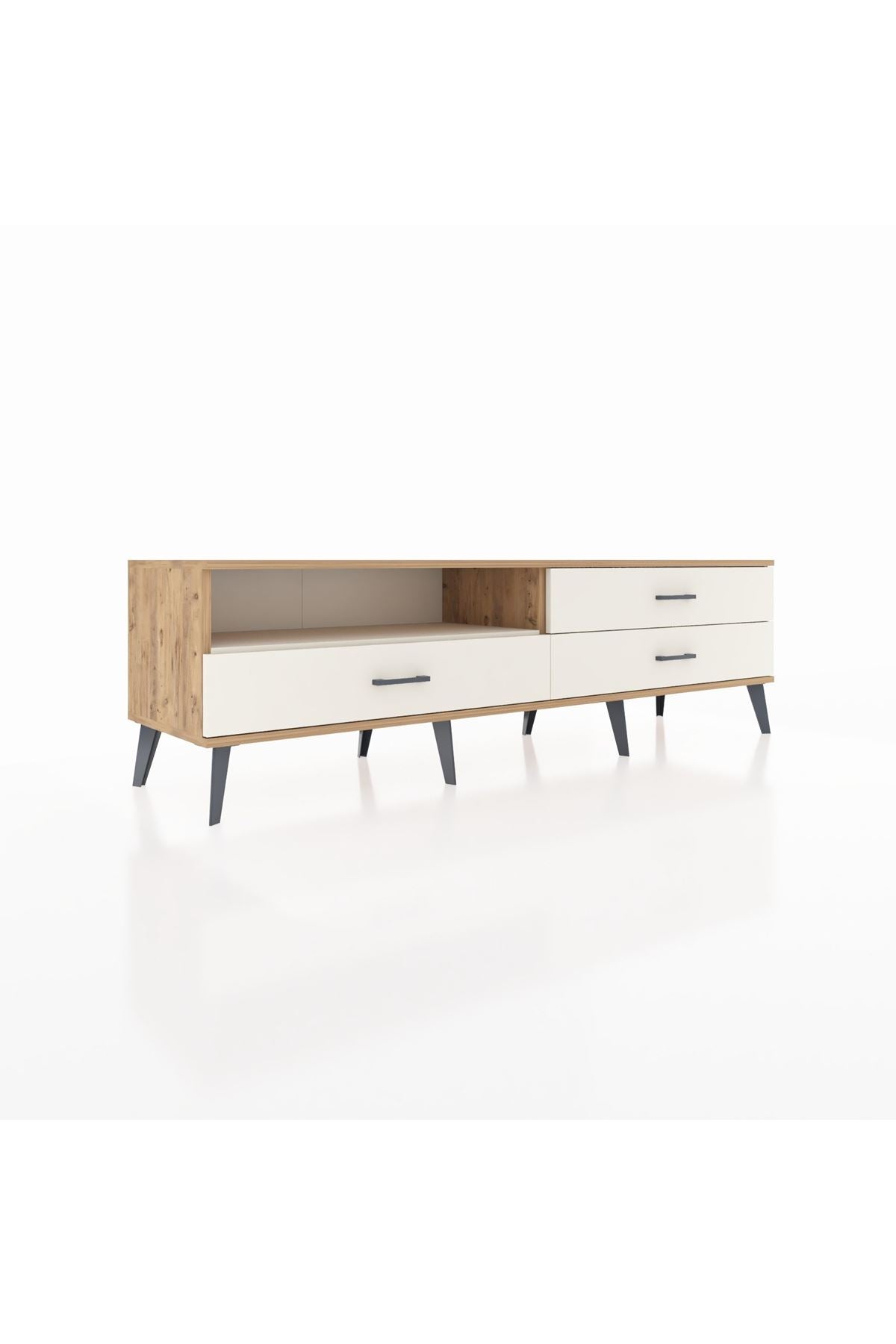 📦 Üç geniş çekmecesi sayesinde fonksiyonellik kazanan Hyperion TV Ünitesi, Çekmeceler 23 cm açılma mesafesi sunar. Detayları kolayca ulaşılabilir hale getirirken, güvenilir paketleme uluslararası taşıma standartlarını karşılar.