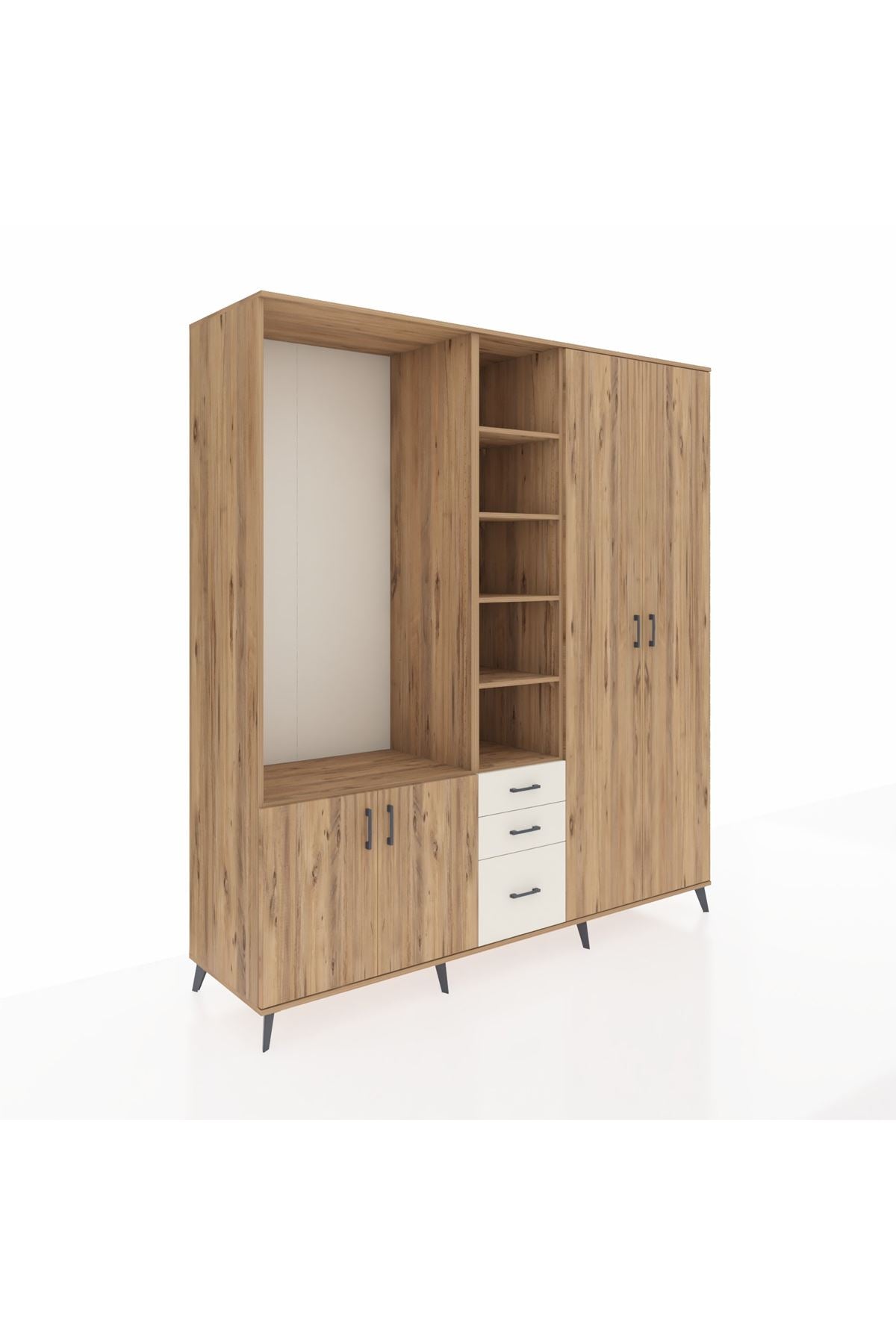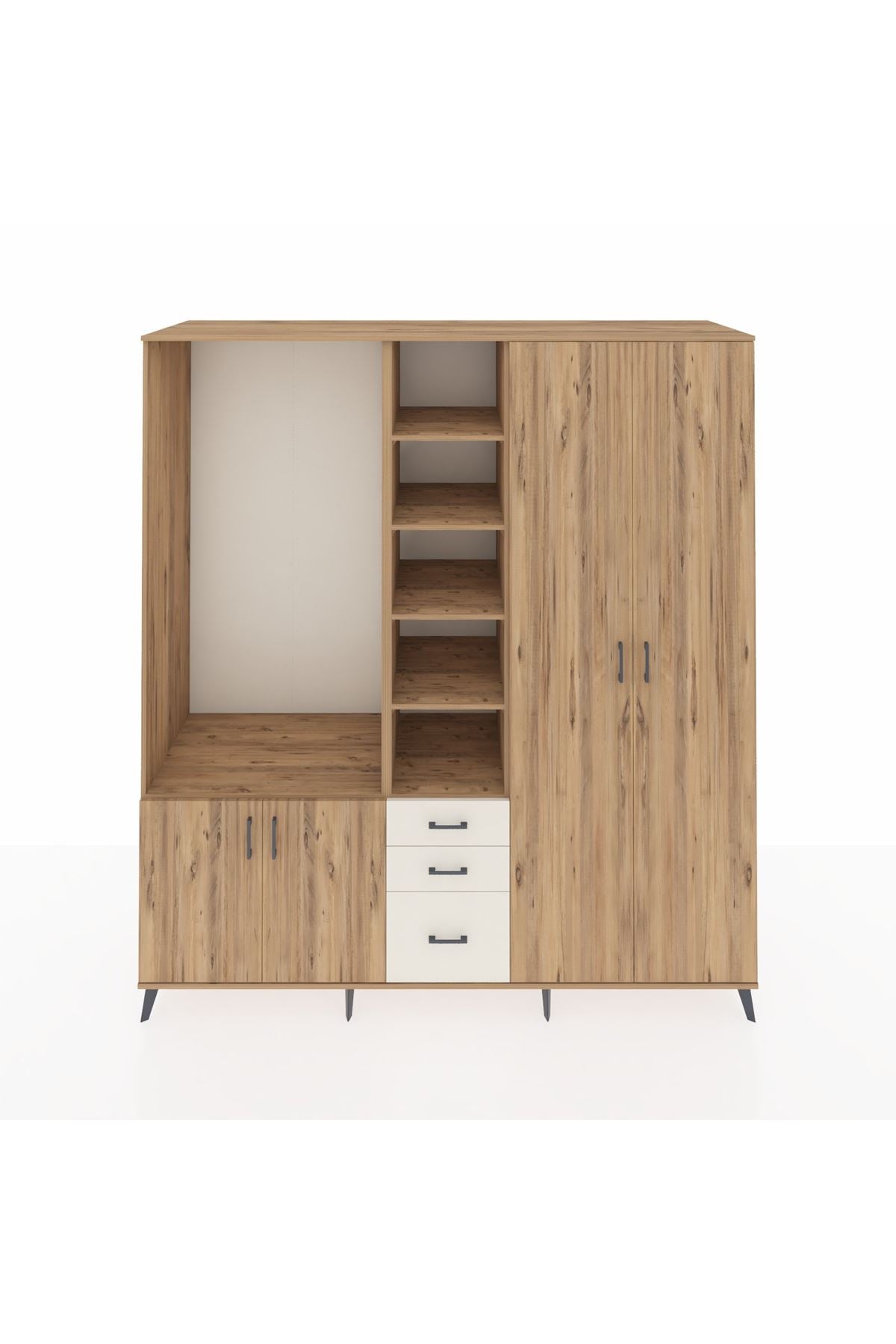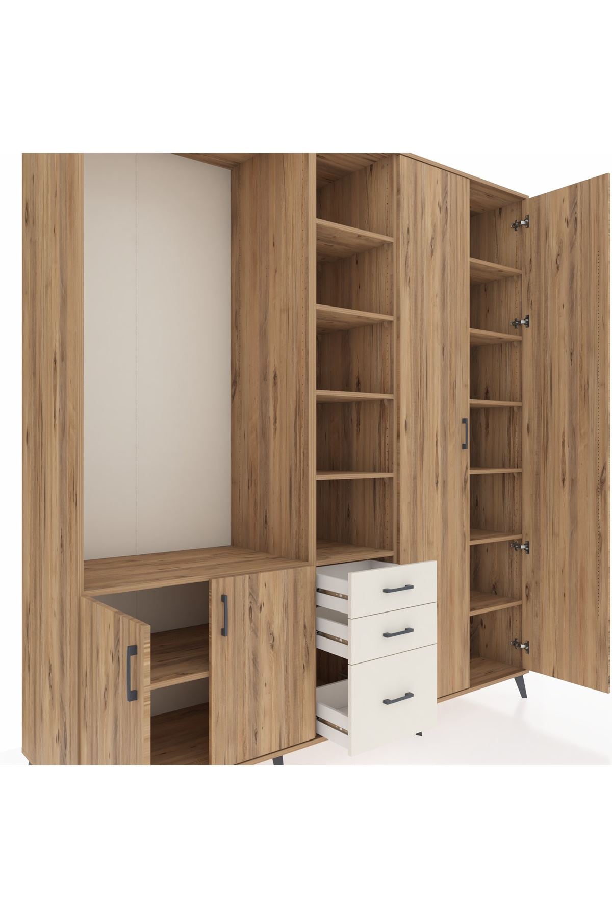 🪵 Göz alıcı metal ayakları ve kulpları, dolaba modern bir dokunuş katarken, Kastamonu Entegre 1. sınıf suntalam gövde ve kapaklar dayanıklılığı garantiler. 1.2 mm kenar bandı detayı ise tüm yüzeylerin uzun ömürlü olmasını sağlar. Çekmeceler 27 cm açılma mesafesi sunar.