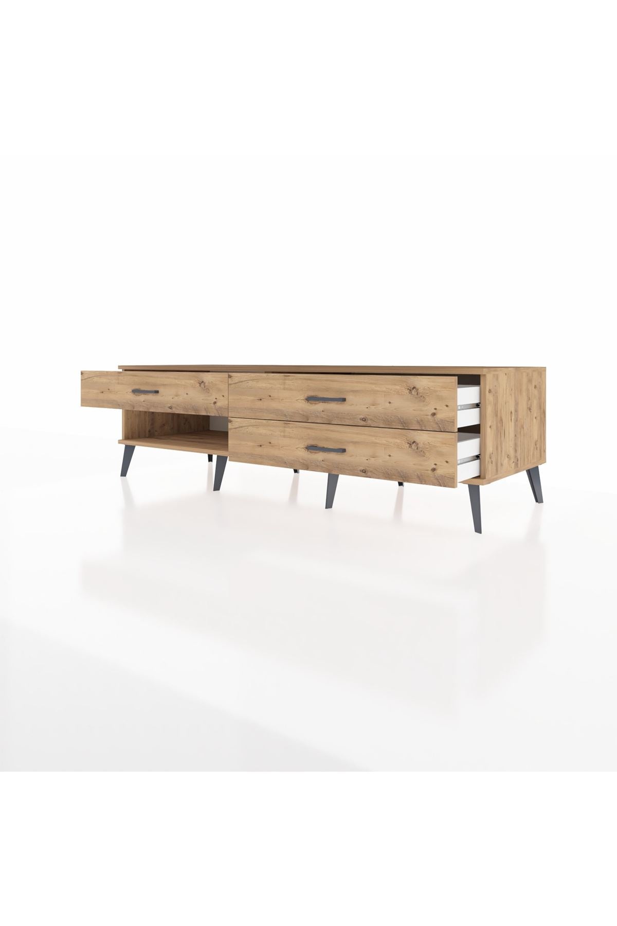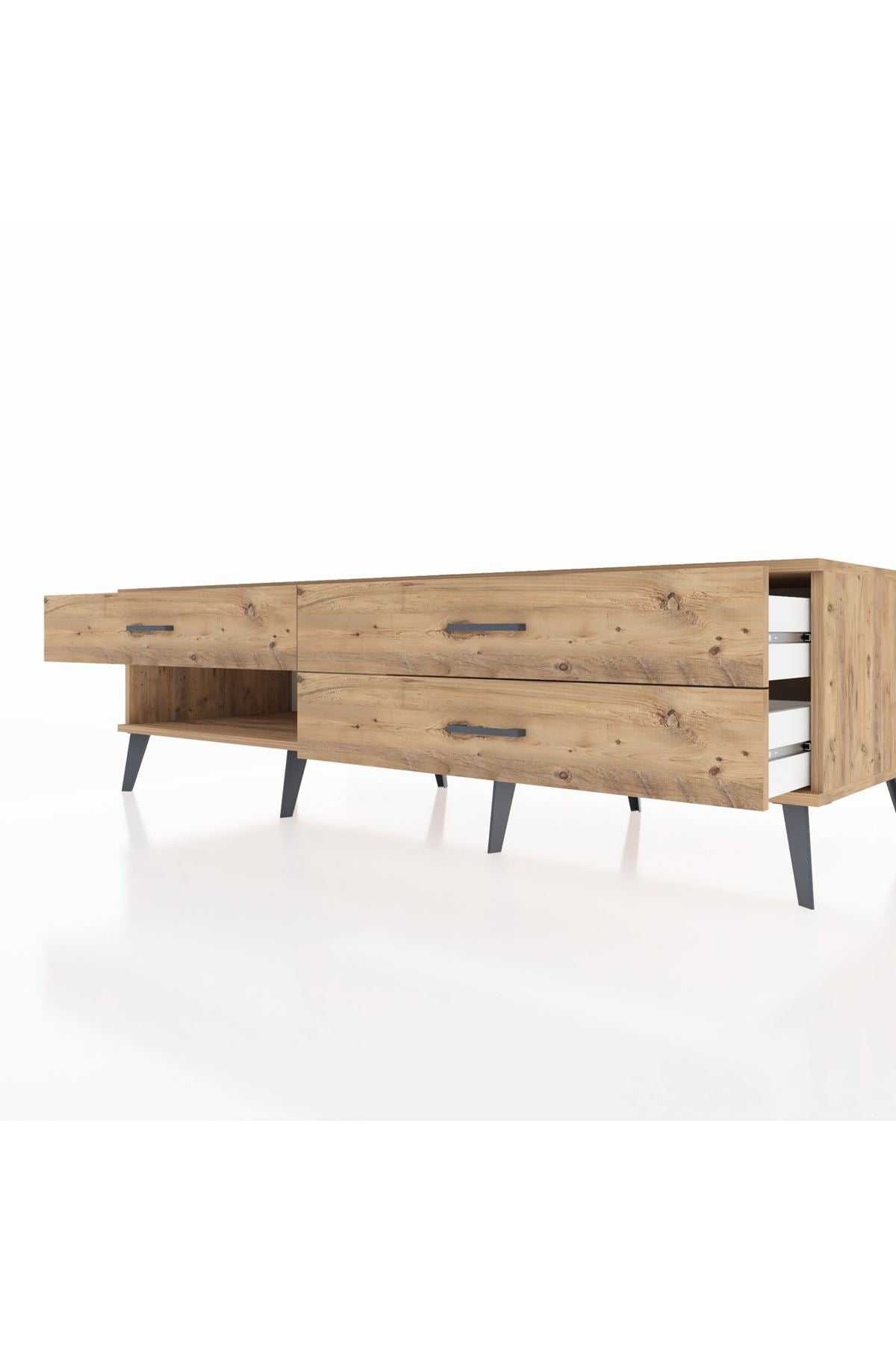 🍃 Kastamonu Entegre 1. sınıf suntalam, dayanıklı çam ağacı dokusuyla buluşarak bu şık TV ünitesinde hayat buluyor. Metal ayak ve kulplar, sağlamlığı modern bir şıklıkla tamamlıyor. Kenarları detaylı işlenmiş 1.2 mm kalınlığında bantlar, estetik bütünlüğü güvence altına alıyor.
