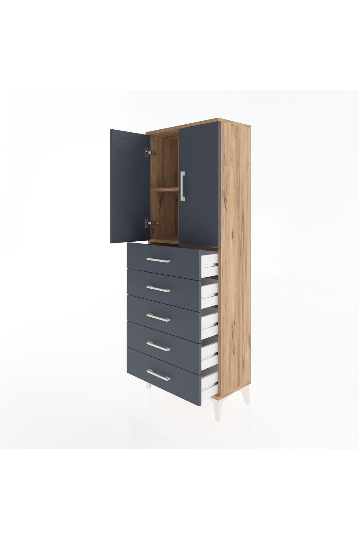 Arges Dolap 2 Raflı 5 Çekmeceli 2 Kapaklı 60x30x163 Çam-Antrasit