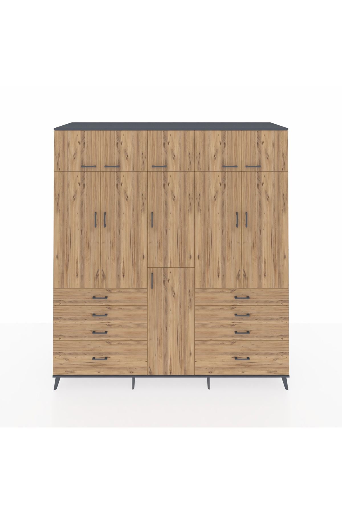 Kronos Dolap 8 Raflı 8 Çekmeceli 3 Askılı 220x59x243 Antrasit-Çam/Çam
